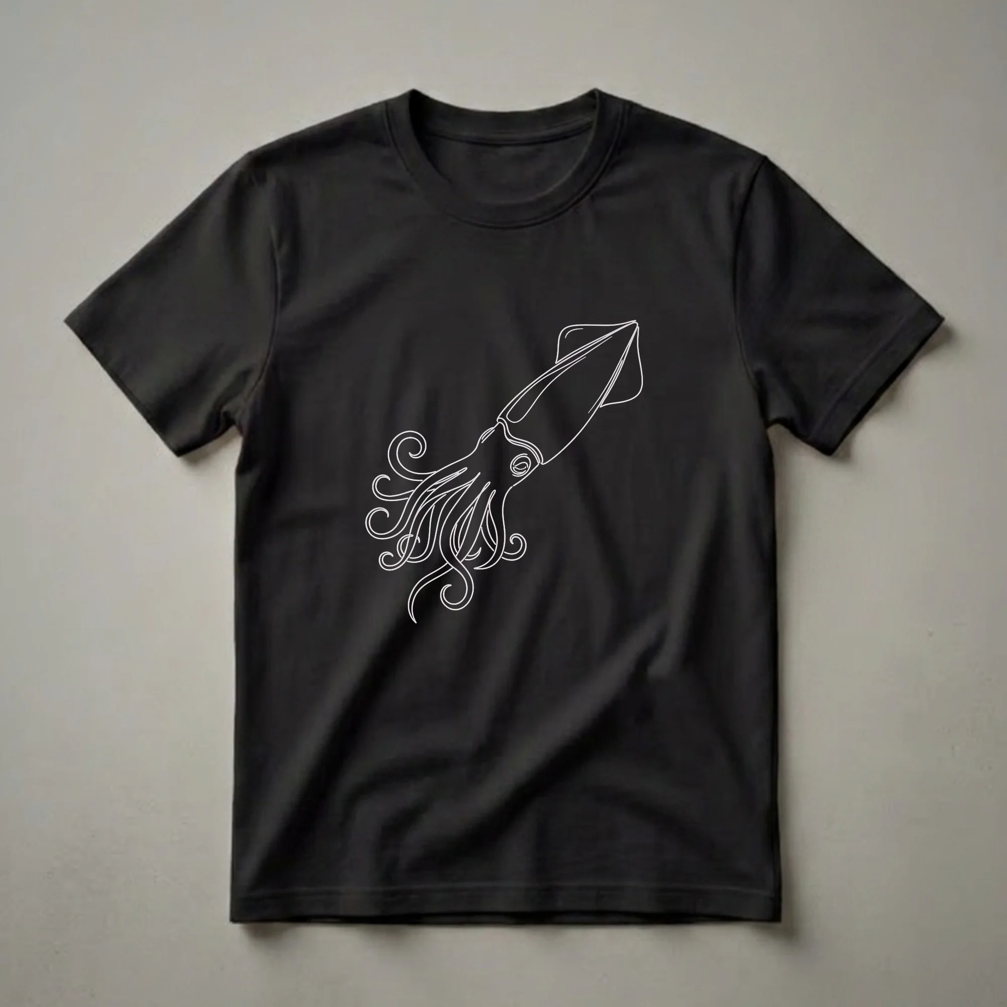 - Features a minimalist white line drawing of a squid on a black shirt.