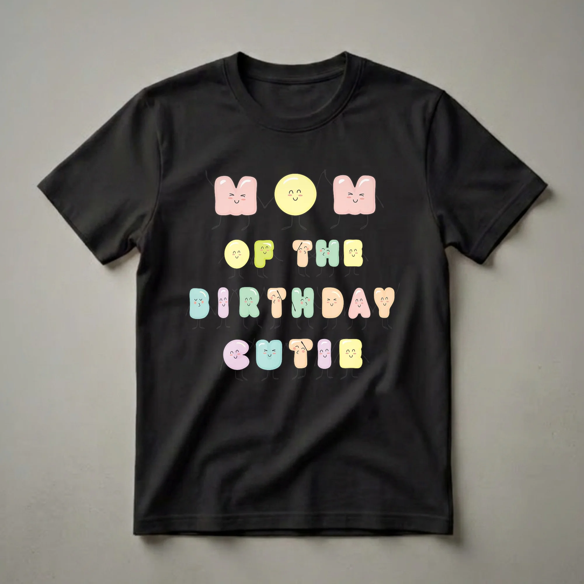 Moms of birthday girls will adore this charming graphic tee featuring the phrase 'Mom Of The Birthday Cutie' in a playful, kawaii style. Each letter is depicted as a cute, anthropomorphic character with rosy cheeks and a happy expression, holding hands with its neighbors. The pastel colors of the letters, pink, yellow, green, peach, and blue, create a soft and cheerful aesthetic, making this shirt a delightful addition to any birthday celebration. This t-shirt is a wonderful way for a mom to show her pride and love for her daughter on her special day. Imagine wearing this to a birthday party, a family brunch, or even just for a casual outing during the birthday week. It’s a thoughtful gift for any mother who wants to highlight her role as the proud parent of the birthday girl. The whimsical design captures the joy and excitement of a child's birthday, making it a memorable piece of apparel. This shirt is a staple for moms who love to celebrate their little ones in style.