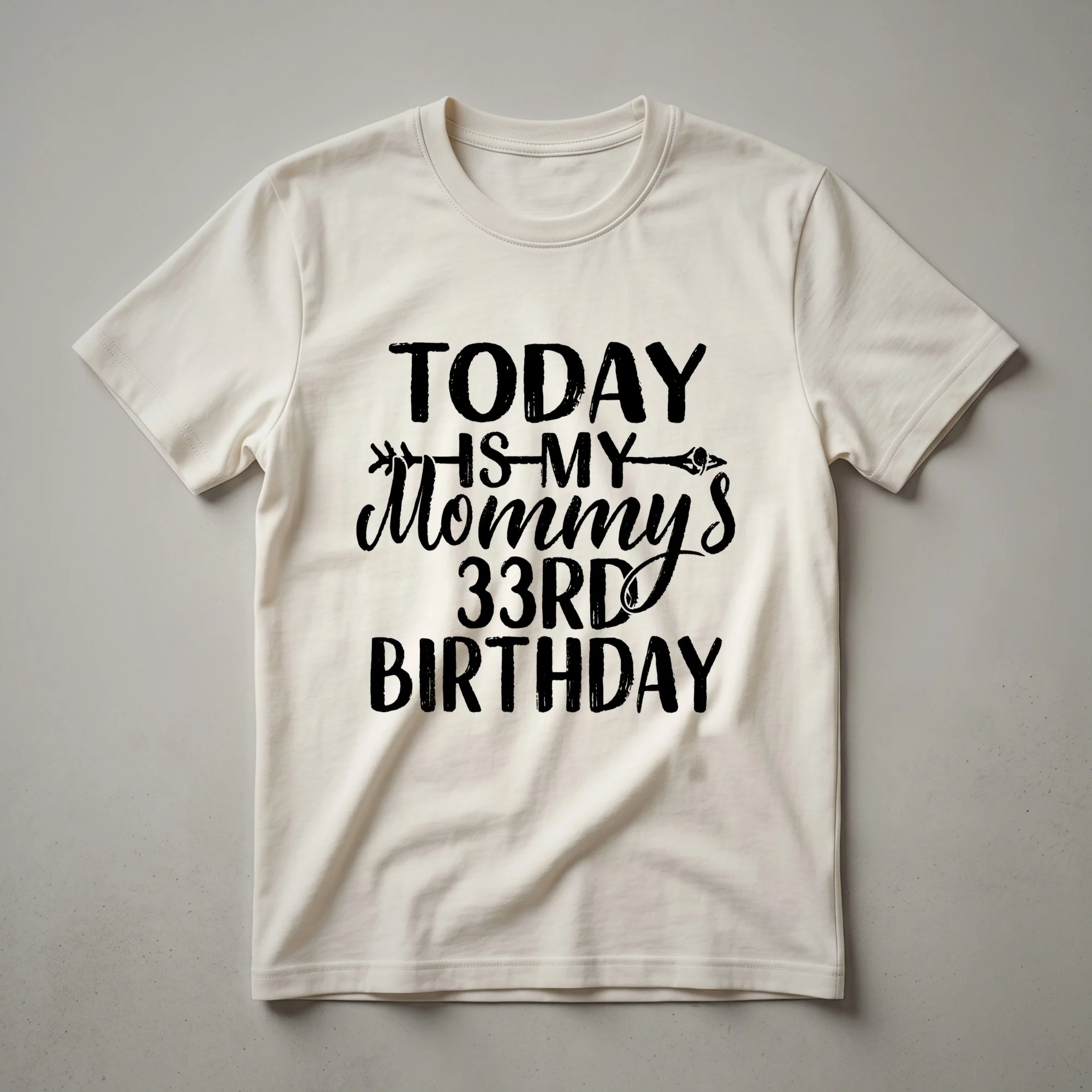 Mom's 33rd birthday is a milestone worth celebrating, and this graphic t-shirt is a fun way to mark the occasion. The design features the phrase 'Today Is My Mommy's 33rd Birthday' in a playful, eye-catching font, making it clear who the star of the party is. This tee is a thoughtful gift for any mother who is turning 33, whether she's a millennial celebrating a significant birthday or simply embracing another year with joy. It's a comfortable and casual option for birthday brunches, family gatherings, or just relaxing at home. The shirt itself is a staple in any casual wardrobe, offering a blend of comfort and personality. Imagine her wearing this to her birthday dinner, receiving compliments and sharing in the festive spirit. This t-shirt is more than just apparel; it's a wearable declaration of a special day, making it a memorable present for the mom in your life. It’s a simple yet effective way to add a touch of fun to her birthday celebrations.