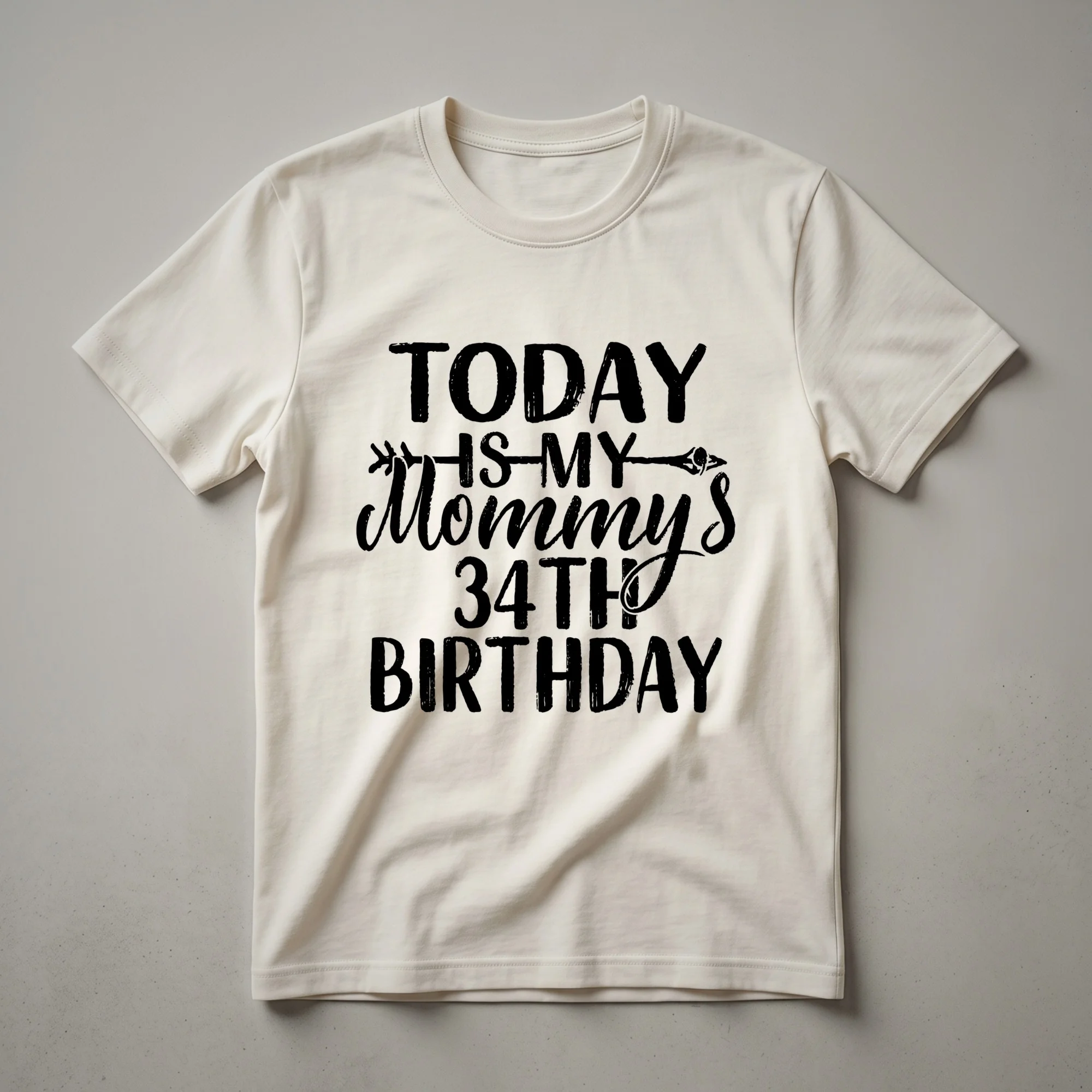 Mom's 34th birthday is a milestone worth celebrating, and this graphic t-shirt is a fantastic way to mark the occasion. The design features bold, eye-catching text that clearly states 'Today Is My Mommy's 34th Birthday'. This shirt is a thoughtful gift for any mom who is turning 34, whether it's for a surprise party, a family gathering, or just a casual celebration. Turning 34 often signifies a vibrant stage of life, balancing personal achievements with family milestones. This tee is a fun way for her to wear her pride and joy on her special day. Imagine her excitement opening this gift, knowing it was chosen specifically for her 34th birthday. It’s a comfortable and stylish piece of apparel that she can wear to birthday dinners, brunches, or any festive event. This shirt is more than just clothing; it's a wearable declaration of a happy birthday for a mom who deserves to be celebrated. It’s a staple in any birthday wardrobe, ready to be worn year after year as a cherished memento of her 34th year.