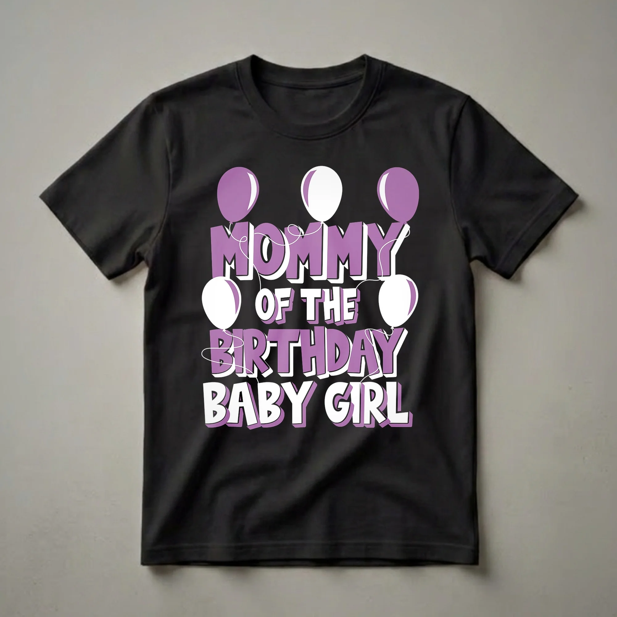 Mommy of the birthday baby girl! This eye-catching graphic tee is worn by the proud mother celebrating her daughter's special day. The bold, 3D-style lettering in purple and white pops against the black background, accented by playful purple and white balloons, creating a festive and celebratory vibe. This shirt is a wonderful way for moms to show their pride and join in the birthday fun. It's a staple for any mom attending a toddler's first birthday, second birthday, or any celebration for their little girl. Imagine the joy of capturing photos with your little one, both wearing coordinating birthday attire. This tee works well for moms who want to feel festive and comfortable while managing the excitement of a toddler's party. It makes a thoughtful gift for any mom whose daughter is celebrating a milestone birthday, from her first year to her fifth. Wear it to the birthday party, brunch, or any family gathering to mark the occasion.