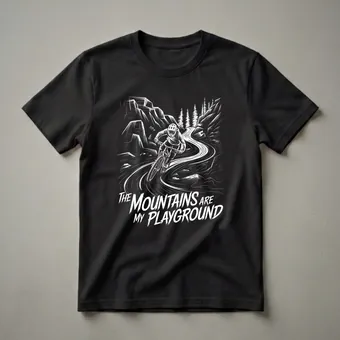 Mountain bikers who embrace the thrill of the descent will reach for this striking graphic tee. The linocut-style artwork depicts a rider in full gear, helmet secured, navigating a steep, winding trail through a rugged mountain landscape. Tall, jagged rocks line the path, with a dense forest of pine trees visible in the background. The dynamic lines of the illustration convey speed and the challenging terrain inherent in downhill mountain biking. This shirt is for the dedicated rider who sees mountains not just as scenery, but as their personal adventure park. It makes a thoughtful gift for any cyclist who lives for the adrenaline rush of hitting the trails. Wear this tee on your next ride, to the bike shop, or while sharing stories of your favorite downhill runs with fellow enthusiasts. The bold text, "The Mountains Are My Playground," perfectly captures the spirit of those who find their ultimate freedom on two wheels, conquering challenging inclines and descents.