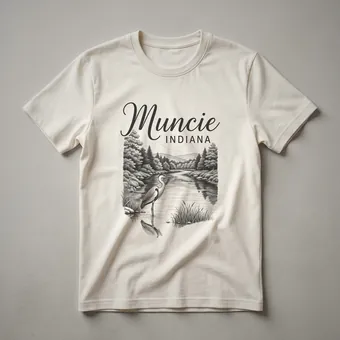 Muncie, Indiana residents and visitors can now wear their appreciation for the Hoosier State's charm with this distinctive sketch art t-shirt. The design prominently features the city name 'Muncie' in an elegant script font, followed by 'INDIANA' in clear block letters. Below the text, a detailed sketch depicts a tranquil natural scene. A majestic heron stands by the water's edge, its reflection shimmering on the calm surface. The landscape is framed by lush trees and reeds, evoking the natural beauty found throughout the Midwest. This tee works well for anyone who calls Muncie home or has fond memories of the area. It makes a thoughtful gift for friends and family who have a connection to this Indiana city. Imagine wearing this shirt to a local festival, a casual outing with friends, or simply while enjoying a walk by the river. The artistic rendering captures a sense of peace and connection to the local environment, making it a unique piece of apparel for showcasing Muncie pride.