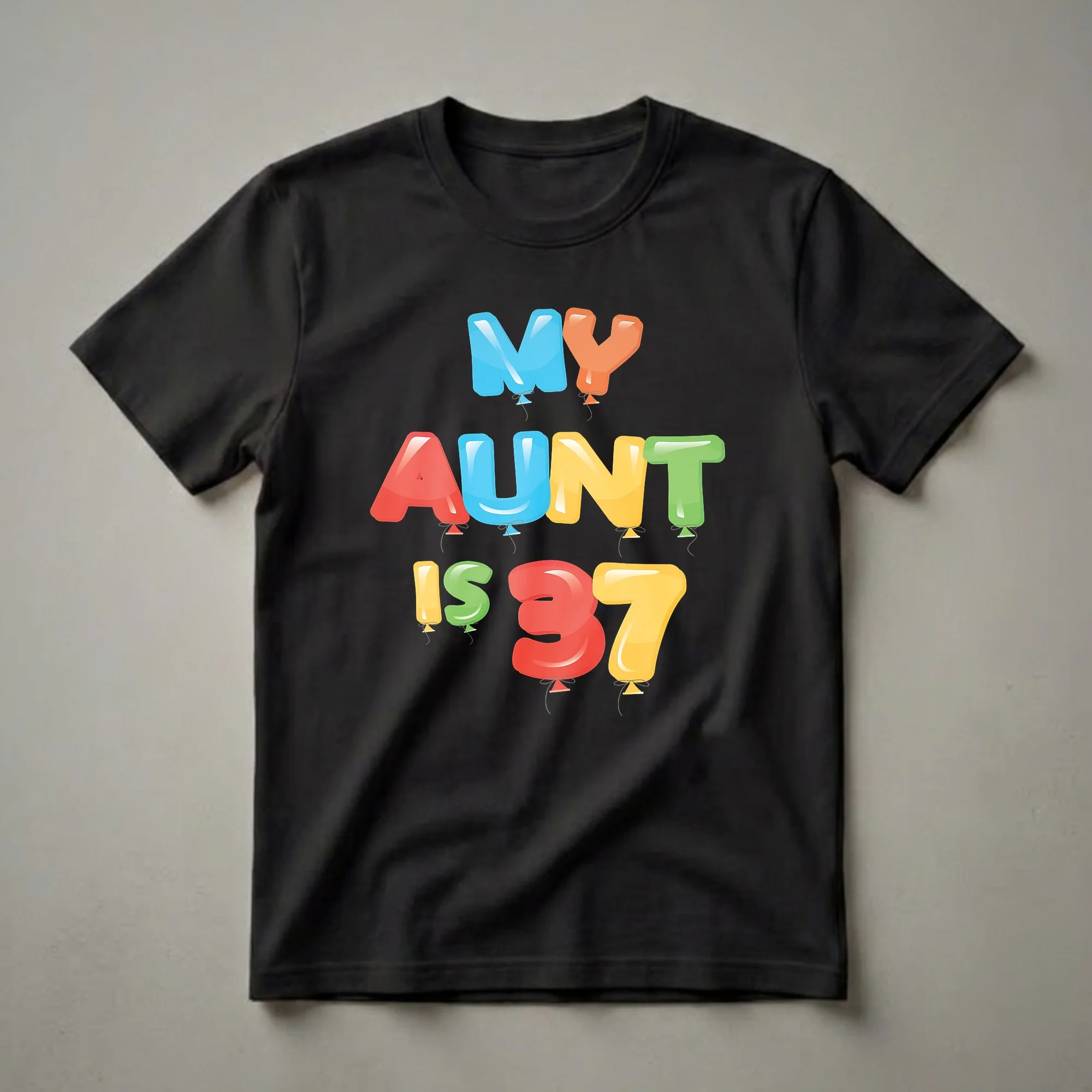 Aunties turning 37 deserve a celebration that pops, and this vibrant graphic tee delivers just that. The design features the phrase "MY AUNT IS 37" rendered in colorful, inflated balloon letters. Each letter is a different bright hue, blue, orange, red, light blue, yellow, and green, complete with strings and a subtle sheen that mimics real balloons. This eye-catching t-shirt is a playful way to acknowledge a significant milestone birthday for any aunt. Whether she's a cool aunt, a fun aunt, or the best aunt, this shirt is a unique way to show appreciation. It's a thoughtful gift idea for nieces and nephews looking to make her 37th birthday memorable. Imagine her wearing this cheerful shirt to a birthday brunch or a casual family gathering, spreading smiles and birthday cheer. This shirt is a staple for any aunt celebrating this particular age, offering a lighthearted and festive addition to her wardrobe. It's a conversation starter and a fun reminder of her special day, a thoughtful choice for anyone who wants to celebrate their aunt's 37th year with a touch of whimsy and color.