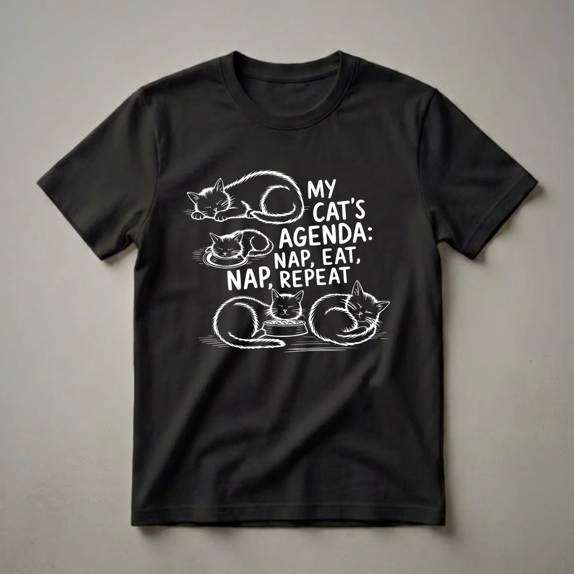 Cat moms and cat dads know that the life of a feline is a simple yet demanding one, revolving around essential activities. This graphic tee captures that sentiment perfectly with its "My Cat's Agenda: Nap, Eat, Nap Repeat" design. The artwork features four distinct white line-art illustrations of cats on a black background. One cat is curled up asleep, another is happily eating from a bowl, and two more are depicted in various stages of rest. This shirt is a humorous nod to the daily schedule of most domestic cats, who spend a significant portion of their day sleeping and eating. Domestic cats, scientifically known as Felis catus, are known for their ability to sleep up to 16 hours a day, making this design relatable for any cat owner. This t-shirt works well for casual wear, whether you're lounging at home with your furry companion or out and about. It makes a thoughtful gift for the cat lover in your life who appreciates a good laugh and understands the feline lifestyle. Anyone who cherishes their cat's predictable yet endearing habits will reach for this tee.