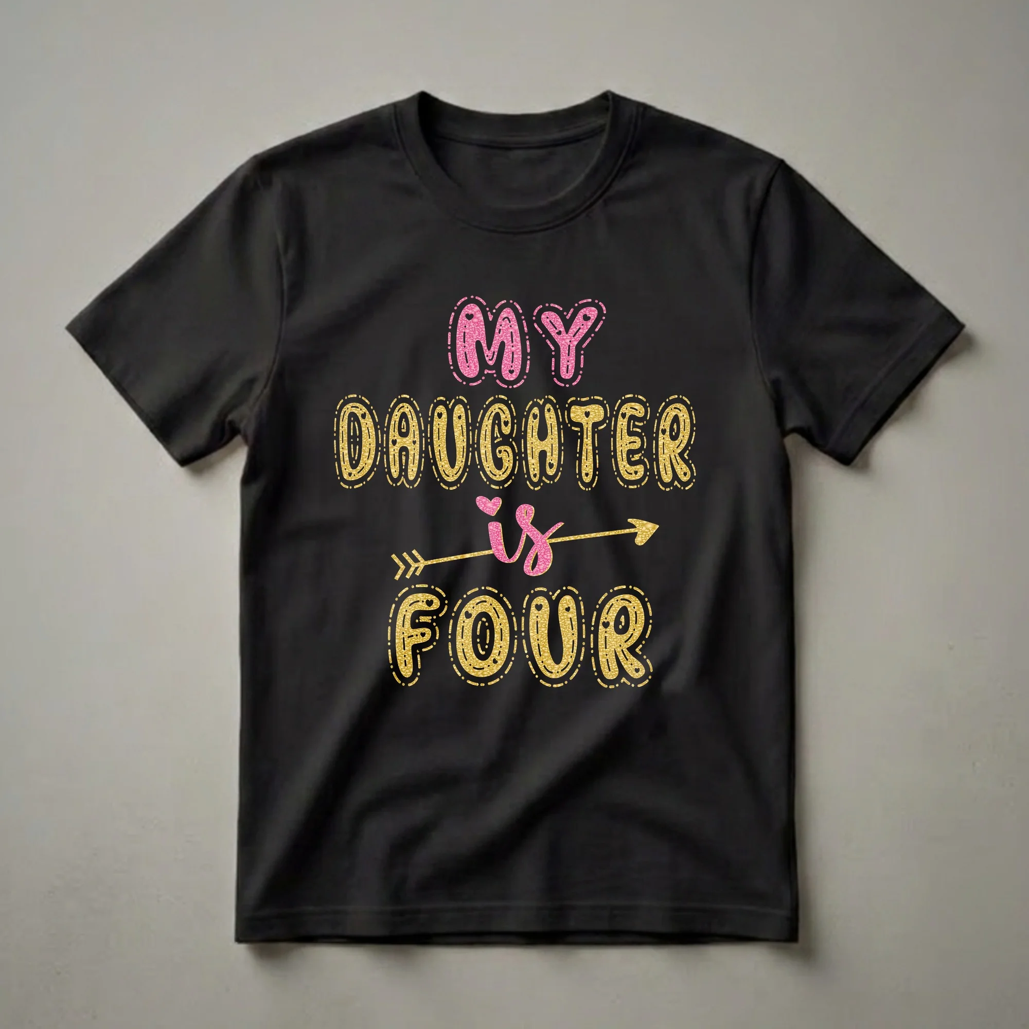 Four years old is a significant milestone, marking a child's transition into early childhood with growing independence and curiosity. This vibrant graphic tee captures that special moment with its playful design. The words 'MY DAUGHTER IS FOUR' are presented in bold, bubbly lettering, with 'MY' and 'FOUR' rendered in a shimmering gold texture, and 'DAUGHTER IS' in a sparkling pink. An arrow pierces through the word 'IS', adding a whimsical touch. This t-shirt is a wonderful way for parents or guardians to celebrate their little girl's fourth birthday. It's a thoughtful gift for any mom looking for a special outfit for her daughter's birthday party, a family gathering, or even just for everyday wear to showcase her big day. Imagine her excitement wearing this festive shirt to her birthday celebration, making memories that will last a lifetime. This shirt is a staple for any 4-year-old's birthday wardrobe, truly a special piece.