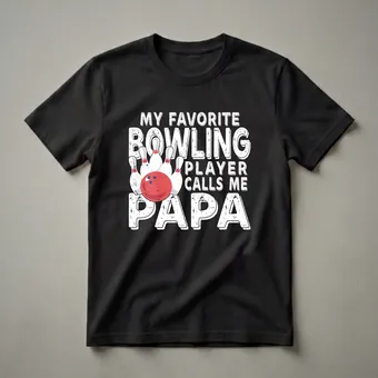 Grandfathers who love to watch their grandchildren bowl will appreciate this humorous graphic tee. The design features bold, distressed white lettering that reads "MY FAVORITE BOWLING PLAYER CALLS ME PAPA." Interspersed with the text are classic bowling imagery: a bright red bowling ball with three blue finger holes and a cluster of white bowling pins, each tipped with a red crown. This shirt is a fantastic way for any papa to show pride in their young bowler's achievements on the alley. Bowling is a sport that can be enjoyed by all ages, fostering family bonding and friendly competition. Whether it's a strike or a spare, every roll is a moment to cherish. This comfortable t-shirt is a thoughtful gift for any papa who enjoys supporting their favorite player from the sidelines, perhaps during league nights or casual family outings to the bowling alley. It's a staple for any papa who loves to boast about their star bowler. This tee works well for casual wear, family gatherings, or even a fun bowling night out.