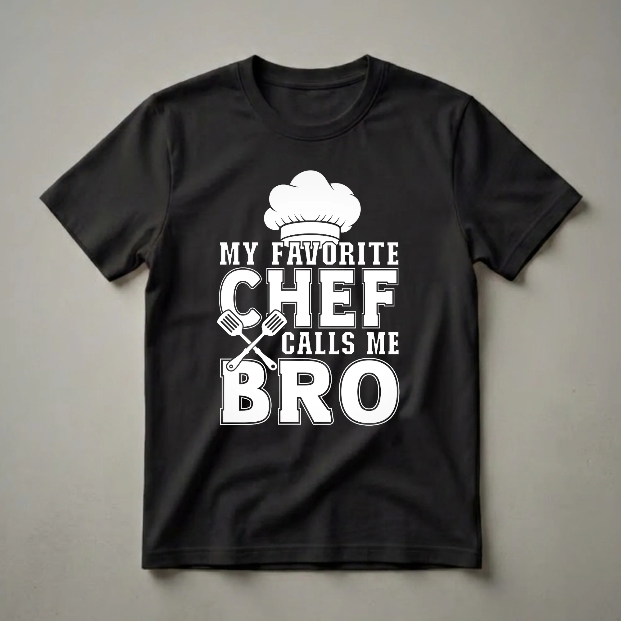 For the brother who always has a spatula in hand or dreams of culinary greatness, this graphic tee speaks volumes. The design features a classic white chef's hat perched above bold, collegiate-style lettering that reads "MY FAVORITE CHEF CALLS ME BRO." Crossed spatulas, essential tools in any kitchen, are placed between "CHEF" and "CALLS ME," adding a playful touch. This shirt is a fantastic way for brothers to celebrate their shared passion for cooking or to acknowledge a sibling who is a professional chef. Chefs are integral to the food service industry, often working long hours to create memorable dining experiences. This t-shirt makes a thoughtful gift for a brother who is a home cook, a culinary student, or a seasoned professional in the kitchen. It's a staple in the collection for anyone who enjoys a good laugh and a great meal. Wear this tee to family gatherings, casual brunches, or while experimenting with new recipes. It's a conversation starter that highlights a unique family bond within the world of food.