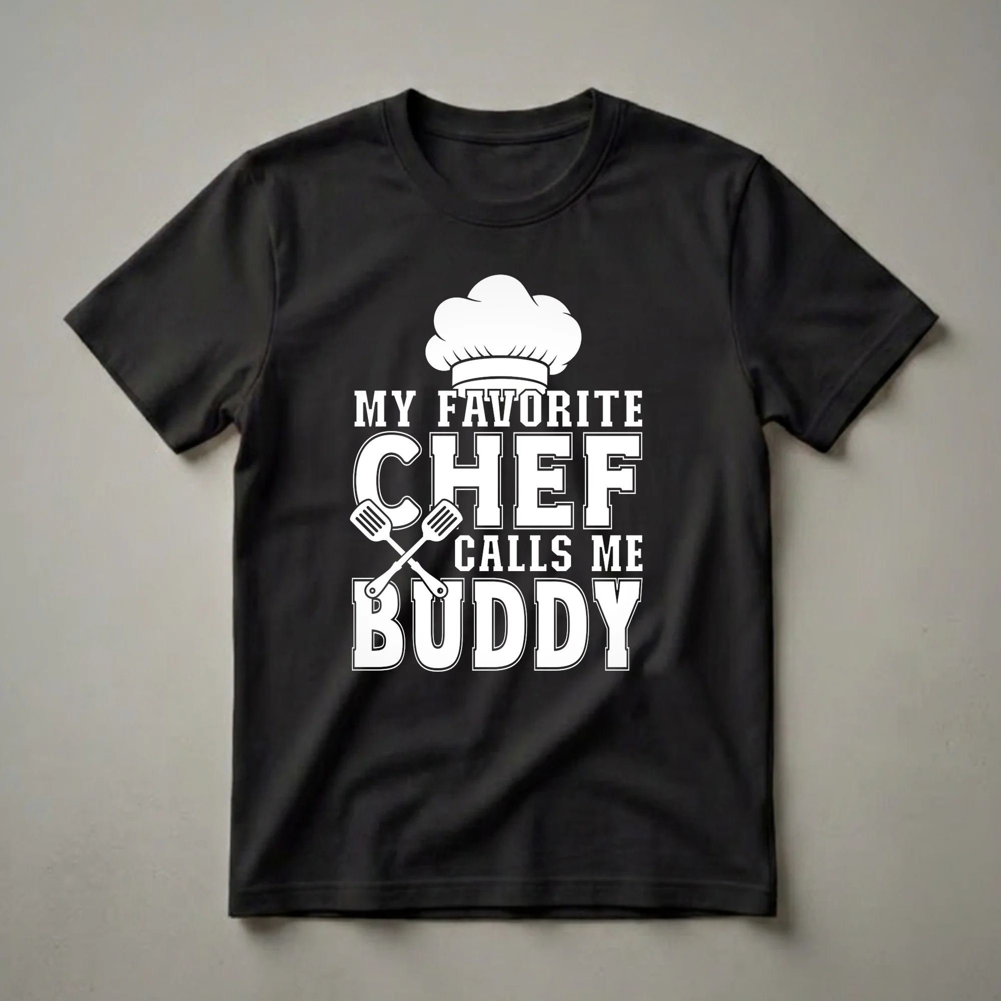 Kids who love to spend time in the kitchen will adore this "My Favorite Chef Calls Me Buddy" graphic tee. The design features a classic chef's hat atop bold white lettering, with crossed spatulas adding a playful culinary touch. This shirt is for the little helper who enjoys assisting their favorite chef, whether that's a parent, grandparent, or a professional cook. It's a fun way for children to express their connection to the culinary world and their pride in being called "buddy" by someone they admire in the kitchen. This t-shirt makes a thoughtful gift for birthdays, holidays, or just because for any child who enjoys cooking or baking alongside a favorite chef. Imagine them wearing this shirt while helping prepare family meals or at a fun cooking-themed party. It’s a comfortable and stylish way for young aspiring chefs to showcase their role in the kitchen. This eye-catching tee is sure to bring smiles to everyone in the family, especially the favorite chef.