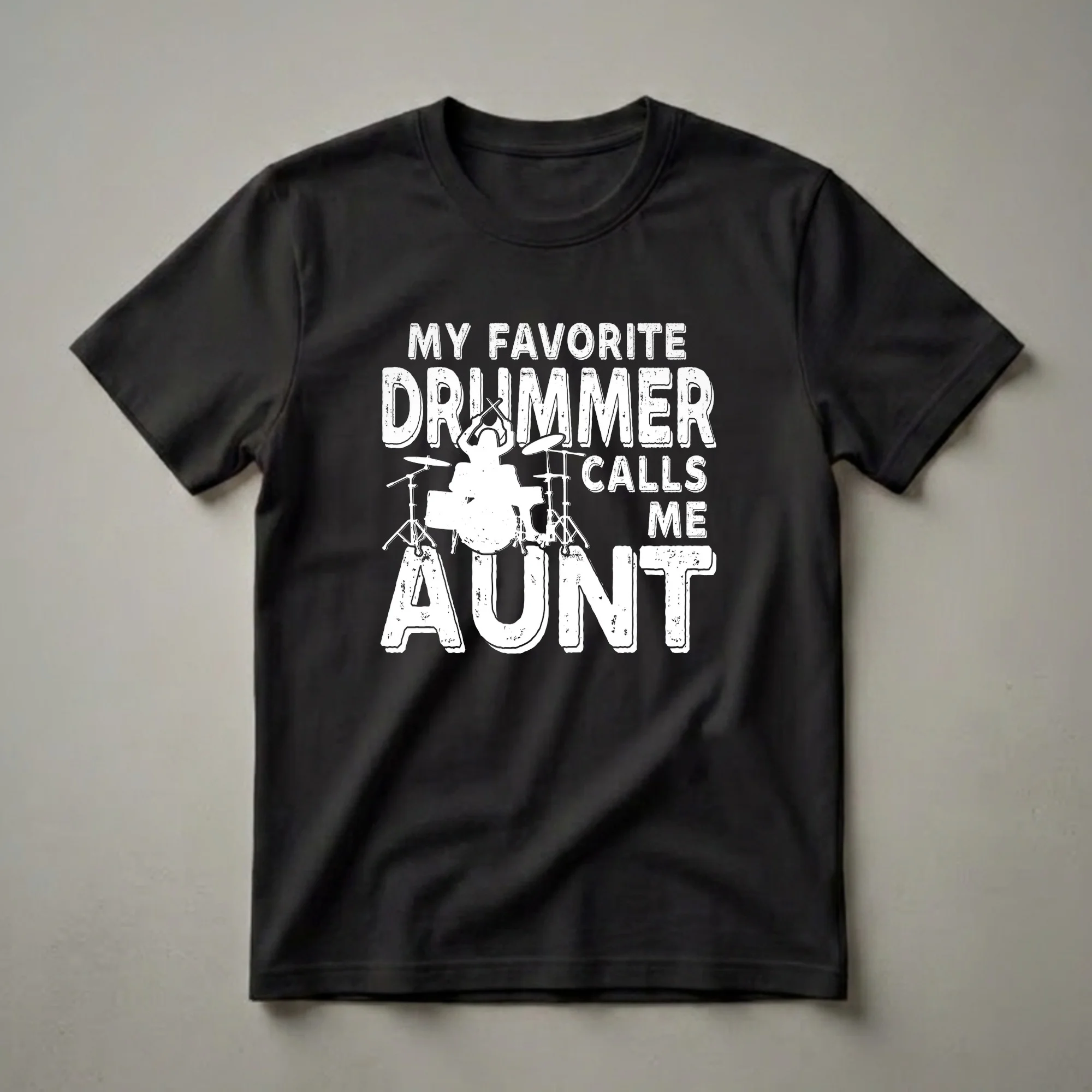 - Features a distressed "My Favorite Drummer Calls Me Aunt" design.