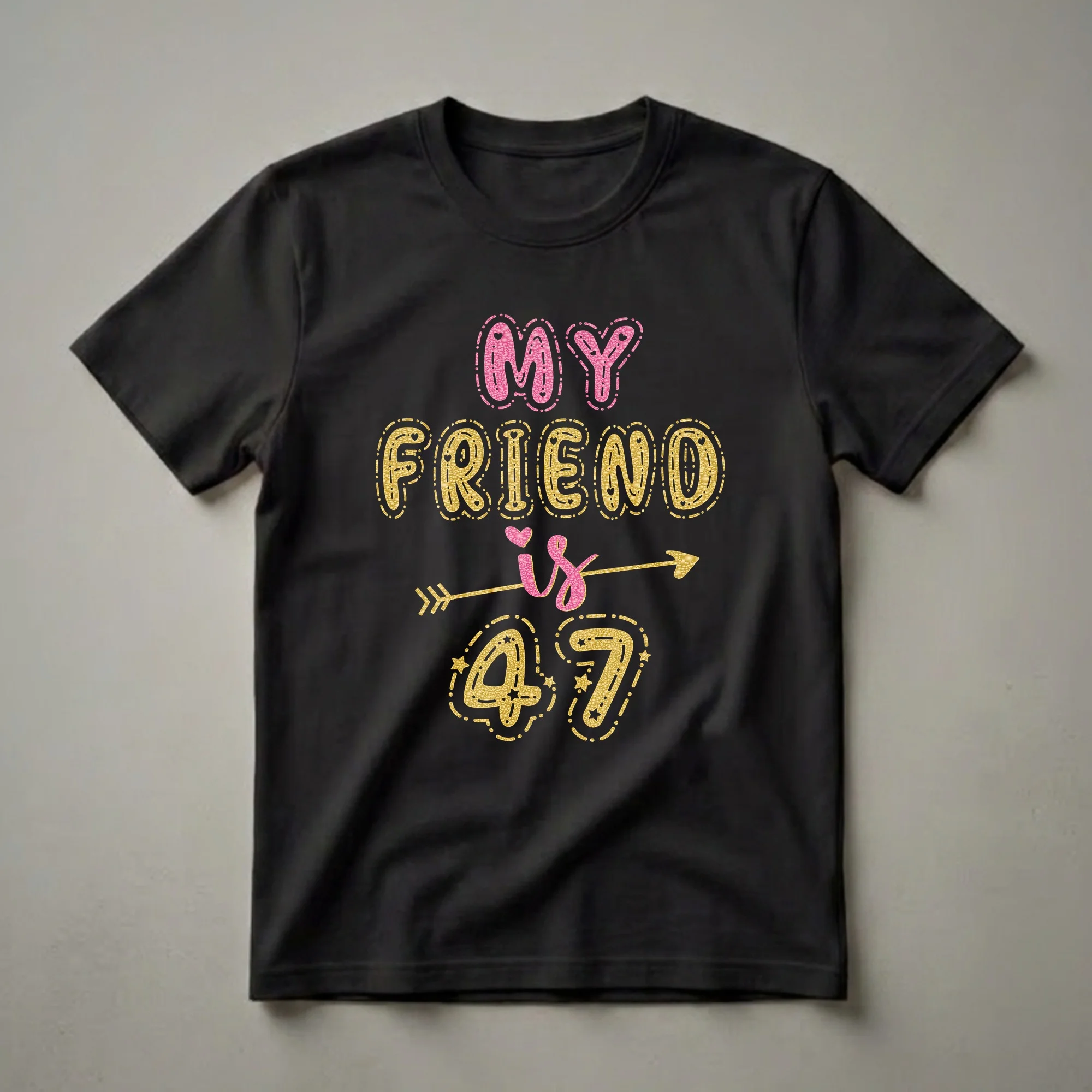 Turning 47 is a significant milestone, and this eye-catching graphic tee is a vibrant way to celebrate the occasion. The design features bold, bubbly lettering with a dazzling glitter effect. The words "MY FRIEND is 47" are prominently displayed, with "MY" and "47" in a shimmering pink, and "FRIEND" in a radiant gold. An arrow with a heart pierces through the word "is," adding a playful touch. The numbers "47" are outlined with stars and dots, enhancing the festive feel. This t-shirt is a thoughtful gift for any woman celebrating her 47th birthday, whether it's a close friend, sister, or partner. It's a fun piece of apparel that she can wear to her birthday dinner, party, or any casual gathering. The glitter accents make this shirt stand out, ensuring she feels special on her big day. This tee is a go-to for celebrating this fantastic age, offering a blend of style and celebratory spirit. It's a wonderful way to show your friend you care and to make her 47th birthday memorable.