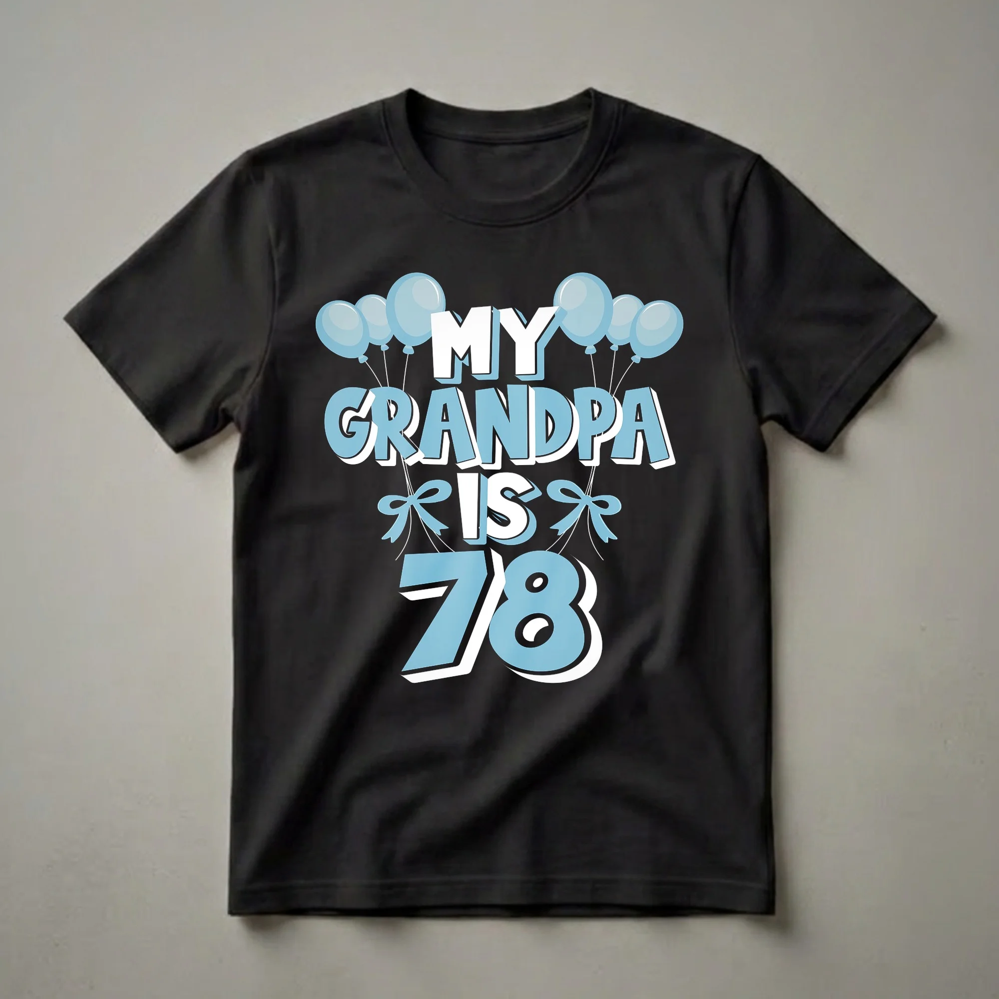 Grandchildren looking to celebrate a milestone birthday for their beloved grandfather will reach for this festive graphic tee. The design prominently features the phrase "MY GRANDPA IS 78" in bold, stylized lettering. Accompanying the text are cheerful light blue balloons with strings and decorative bows, all set against a solid black background. This t-shirt is a thoughtful gift for any grandfather turning 78, whether it's for a birthday party, a family gathering, or just to show him how much he's loved. Turning 78 marks a significant point in life, often a time for reflection and enjoying the fruits of a lifetime of experiences. This shirt serves as a wearable declaration of pride and affection from his grandchildren. It's a comfortable and eye-catching piece of apparel that he can wear to casual celebrations, family dinners, or simply while relaxing at home. Imagine him opening this gift and seeing the joy on his face as he realizes it's a special tribute to his 78 years. This graphic shirt is more than just clothing; it's a keepsake that commemorates a special birthday milestone.