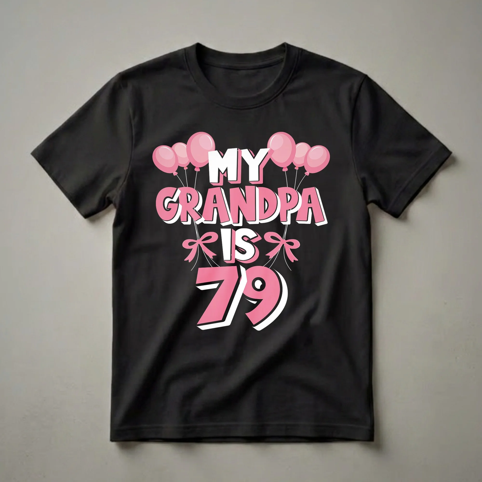 Turning 79 is a significant milestone, and this graphic tee is a vibrant way to celebrate your grandpa. The design prominently features the phrase "MY GRANDPA IS 79" in bold, eye-catching pink and white lettering, accented by playful pink balloons and bows. This shirt is a fantastic way for grandchildren to show their love and celebrate their grandfather's special day. It’s a perfect gift for a grandpa who appreciates a touch of fun and festivity. Imagine him wearing this at his birthday party, family gathering, or even just for a casual outing, bringing smiles to everyone around him. This t-shirt serves as a wearable declaration of affection and a reminder of the joy he brings. It’s more than just apparel; it’s a celebration piece for the patriarch of the family. This tee works well for any grandchild looking to make their grandpa feel extra special on his 79th birthday, whether it's a gift from a young child or an adult. It’s a thoughtful gift idea that he will surely cherish and wear with pride.