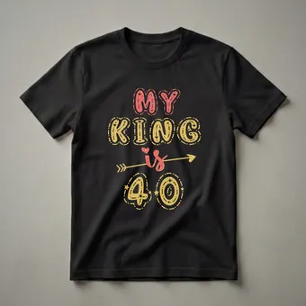 Marking four decades is a significant milestone, and this graphic tee celebrates that special occasion for the man in your life. The design features bold lettering with a shimmering glitter effect, proclaiming 'MY KING is 40'. The words 'MY KING' are rendered in a vibrant red glitter, while 'is' is a smaller, script-style red glitter word with a heart above it. An arrow in gold glitter pierces through the 'is', adding a dynamic touch. The number '40' is prominently displayed in gold glitter, accented with stars and playful dashed outlines. This t-shirt is a thoughtful gift for a boyfriend, husband, or any man turning the big 4-0. It's a fun way for him to wear his birthday pride, whether he's celebrating at a party, enjoying a special dinner, or just wants to show off his new age. This shirt is a great conversation starter and a memorable keepsake from his 40th birthday celebration. Give him a gift that’s as vibrant and celebratory as the occasion itself.