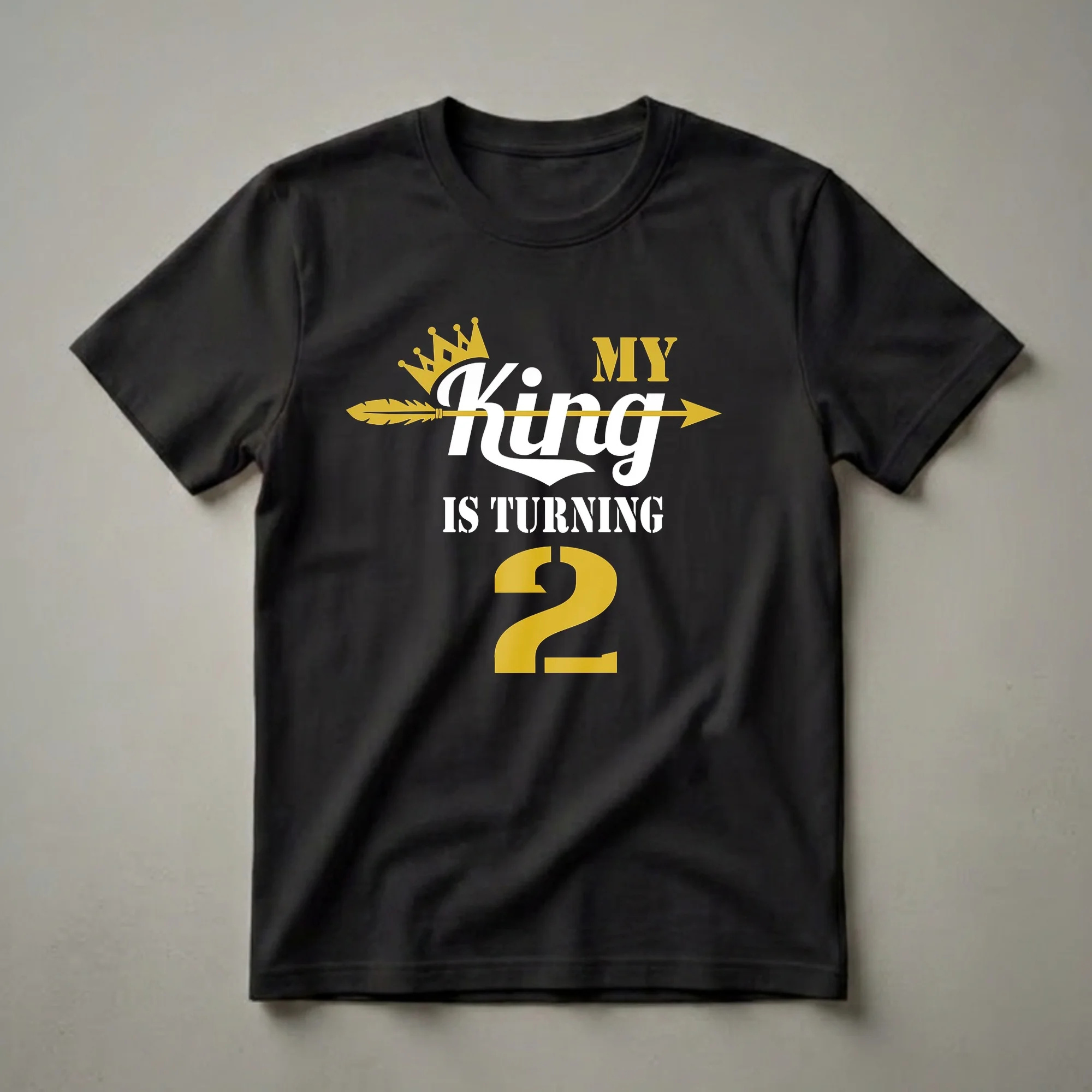 - This 'My King Is Turning 2' shirt boasts a regal golden crown and royal text.