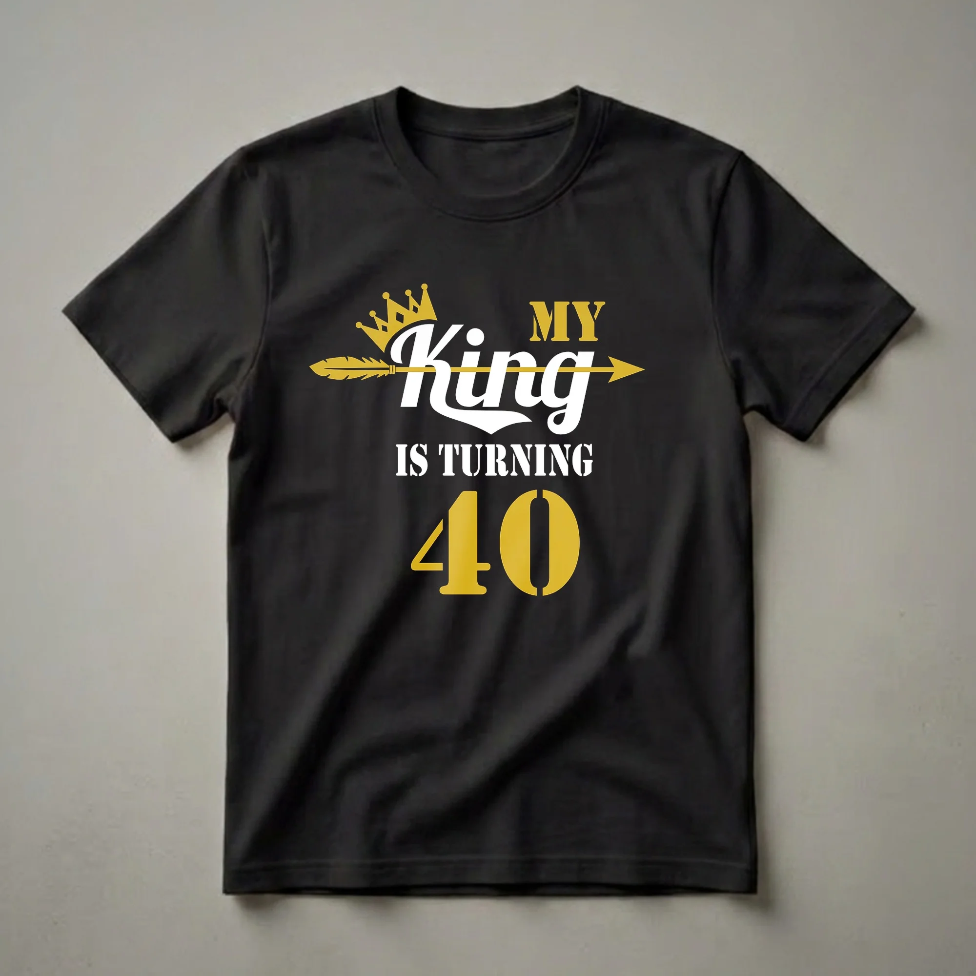 Men celebrating their 40th birthday will reach for this eye-catching graphic tee. The design features a golden crown atop the word 'King' in bold white lettering, with a golden arrow piercing through the text and pointing to the right. Below, the phrase 'IS TURNING' appears in white, followed by a large, prominent '40' in gold. This shirt is a bold declaration for any man entering his fifth decade. Forty is a significant milestone, often marking a transition into a more established phase of life, a time when one can truly feel like royalty. This t-shirt serves as a fun and celebratory way to acknowledge this important birthday. It makes a thoughtful gift for husbands, fathers, brothers, or friends who are turning 40. Imagine him wearing this shirt to his birthday dinner or a casual get-together with loved ones, sparking conversations and smiles. This graphic shirt is a staple for any birthday celebration, offering a unique way to mark the occasion.