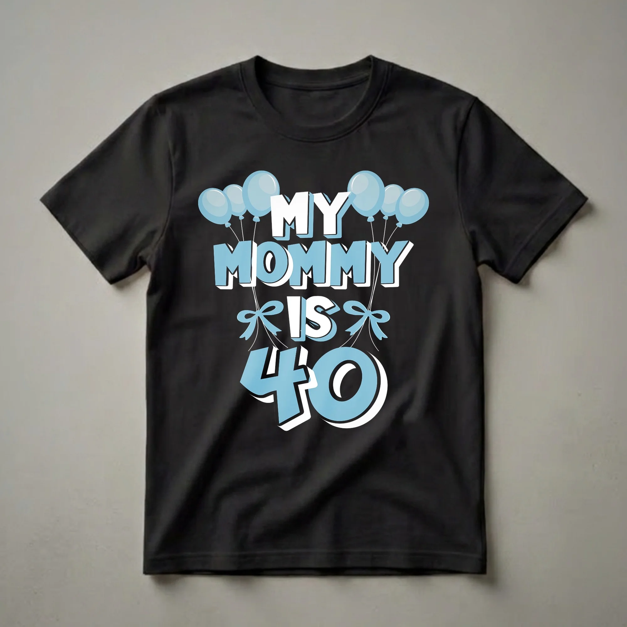Turning 40 is a significant milestone, and this vibrant graphic tee is a celebratory way for a child to announce their mom's big day. The design features bold, stylized text that reads "MY MOMMY IS 40" in a playful font, with the number "40" prominently displayed in a larger, eye-catching size. Accompanying the text are cheerful blue balloons tied with light blue bows, adding a festive and celebratory atmosphere to the graphic. This t-shirt is a thoughtful gift for any mother hitting this milestone birthday, whether from a young child or an adult child wanting to mark the occasion. It's a fun way for Mom to wear her age with pride at birthday parties, family gatherings, or casual outings during her 40th year. The design's clear message makes it an instant conversation starter, well suited for celebrating this special chapter. This shirt is a wonderful keepsake for the birthday queen, a true staple in her birthday wardrobe.