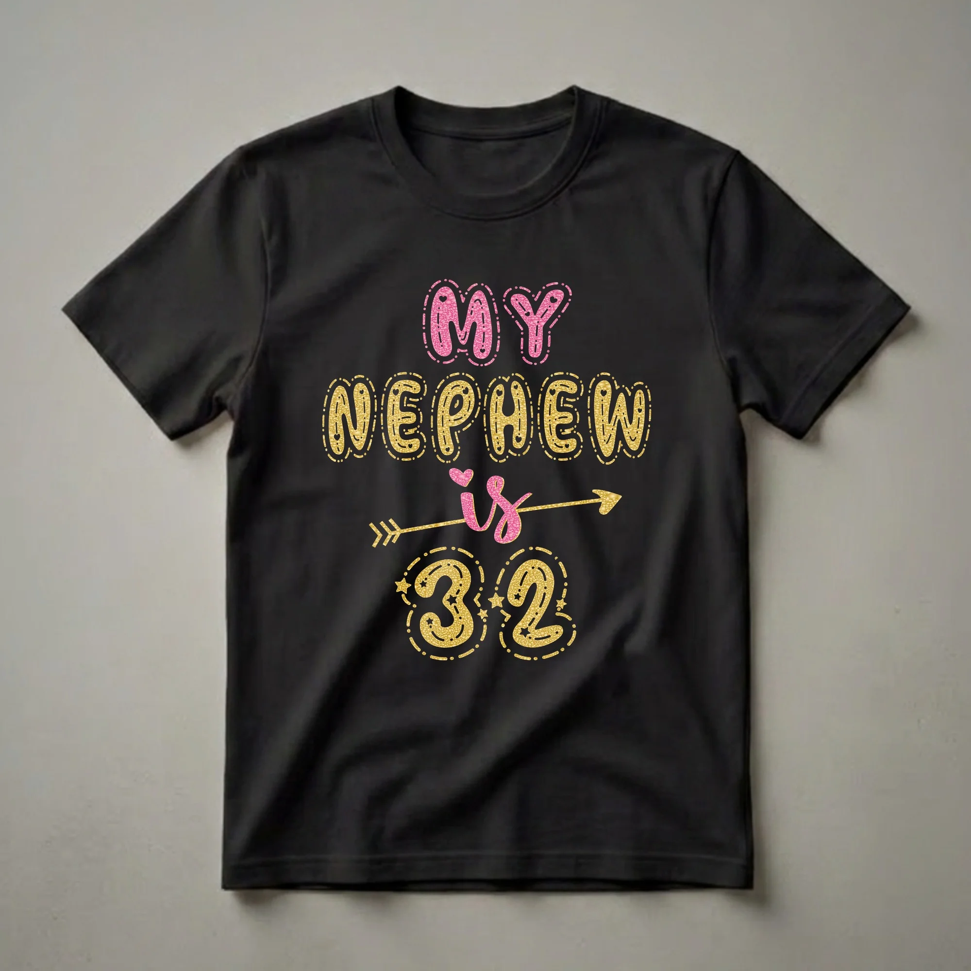 Celebrate your favorite 32-year-old nephew's birthday with this sparkling graphic t-shirt featuring his special age in bold glitter. This eye-catching graphic tee is designed to celebrate that special occasion for your nephew. The design features playful, bubble-like letters filled with a shimmering gold glitter texture, spelling out "MY NEPHEW is 32". The word "MY" and the "is" are rendered in a vibrant pink glitter, adding a pop of color. An arrow graphic, also in glittering gold, shoots across the design, symbolizing forward momentum and direction. The numbers "32" are prominently displayed in the same dazzling gold glitter, accented with small stars and dashed lines, making the age unmistakable. This t-shirt is a thoughtful gift for any aunt or uncle looking to celebrate their nephew's 32nd birthday. It’s a fun way to show him you’re thinking of him on his big day. He will reach for this tee to wear to his birthday dinner, a casual get-together with friends, or any celebration marking this important year. This shirt is a fantastic way to add a festive touch to his birthday festivities and create a memorable moment.