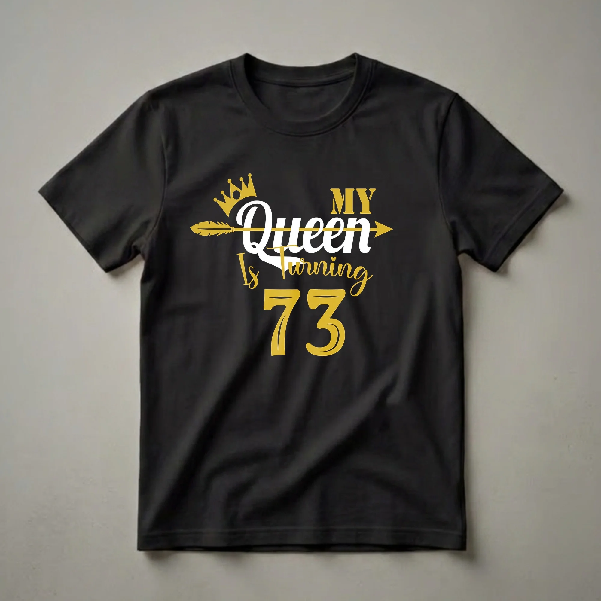 Seventy-three years young and still reigning supreme! This eye-catching graphic tee is made for the queen in your life who is celebrating her 73rd birthday. The design features a regal gold crown and a golden arrow piercing through the word 'Queen', emphasizing her majestic status. Below, the phrase 'My Queen Is Turning 73' is presented in elegant fonts, with the number '73' prominently displayed in a bold, golden hue. This shirt is a fantastic way for her to showcase her milestone birthday with pride and style. It makes a thoughtful gift for any mother, grandmother, aunt, or friend who is reaching this significant age. Imagine her delight when she unwraps this special t-shirt, ready to wear it to her birthday dinner, party, or any celebratory gathering. This comfortable tee is a staple in any birthday wardrobe, offering a blend of celebratory spirit and personal flair. It's a wearable declaration of her royal status as she enters a new chapter at 73. This shirt is a go-to tee for any woman who embraces her age with grace and a touch of queenly charm.