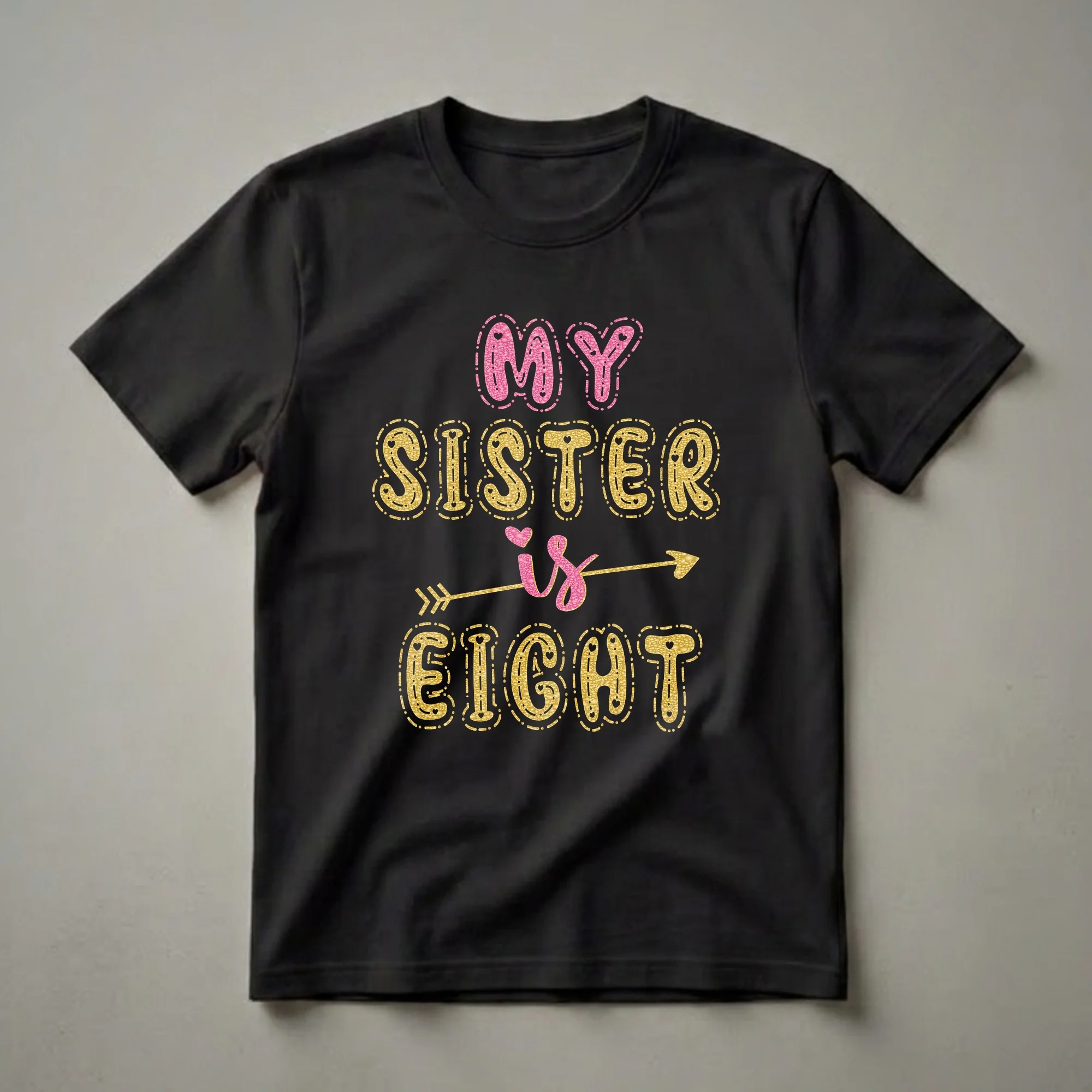 Eight is a milestone age, marking a transition into double digits and a world of new adventures. This vibrant graphic tee captures the excitement of turning eight, featuring bold, glittery lettering that pops against a classic black background. The words "MY SISTER is EIGHT" are displayed prominently, with "MY" and "is" in a playful pink hue, while "SISTER" and "EIGHT" shimmer in a dazzling gold. An arrow playfully pierces through the "is," adding a touch of whimsy to the design. This t-shirt is a thoughtful gift for any girl celebrating her eighth birthday, whether it's for a birthday party, a family gathering, or just to make her feel extra special. She will reach for this shirt to wear to school, playdates, or any occasion where she wants to show off her big eight status. It’s a fun way for her to express her age and personality. Imagine her delight when she unwraps this eye-catching shirt, ready to celebrate her special day in style. This tee is a fantastic way to commemorate this exciting birthday year.