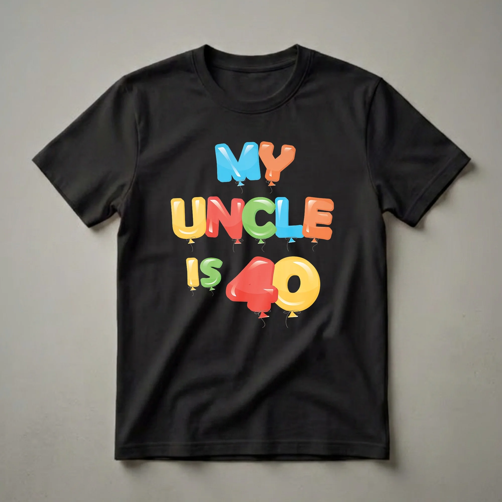 Uncle's turning 40? This vibrant graphic tee is a fantastic way to celebrate his milestone birthday. The design features bold, colorful letters shaped like balloons, spelling out the celebratory message 'MY UNCLE IS 40'. Each letter is rendered in a glossy, inflated style, with shades of blue, orange, yellow, red, and green, complete with strings and small triangular tags, giving the impression of a festive balloon bouquet. This eye-catching t-shirt is a thoughtful gift for any niece or nephew looking to honor their uncle's big day. It's a fun and lighthearted way to acknowledge him reaching this significant age. Imagine him wearing this shirt to his birthday dinner or a casual get-together with family and friends. The 40th birthday is a major milestone, often seen as the transition into the prime of adulthood, marking a time of established career and personal life for many. This shirt captures that celebratory spirit. It's a comfortable and casual piece of apparel that he can wear to show off his birthday pride. This graphic tee makes a thoughtful gift for the uncle who appreciates a bit of fun and humor on his special occasion. It's a unique birthday shirt that stands out from the crowd.