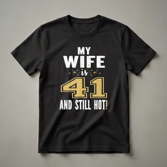 - Bold distressed white lettering proclaims 'MY WIFE is 41 AND STILL HOT!' on this milestone birthday tee.