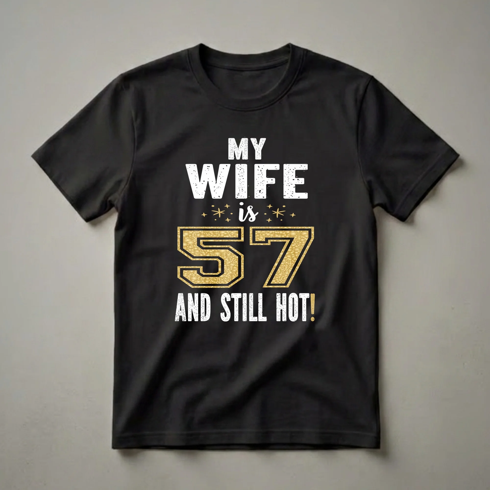 Fifty-seven is a milestone year, and this t-shirt celebrates it with flair. The graphic features bold, distressed white lettering that reads 'MY WIFE is 57 AND STILL HOT!'. The number '57' is prominently displayed in a striking gold texture, reminiscent of a shimmering, bubbly surface, outlined in black. Small gold starbursts and dots add a festive touch around the word 'is'. This tee is a fantastic way for a husband to show appreciation for his wife on her special day. It's a playful and loving statement that acknowledges her enduring attractiveness and vitality as she enters a new chapter. This shirt works well for a wife celebrating her 57th birthday, making her feel cherished and confident. It makes a thoughtful gift from a husband who still finds his wife incredibly appealing. She can wear this shirt to her birthday party, a casual brunch, or any celebration marking this significant age. It’s a conversation starter and a declaration of enduring love and admiration. This graphic tee is a unique way to honor her and her fabulousness.