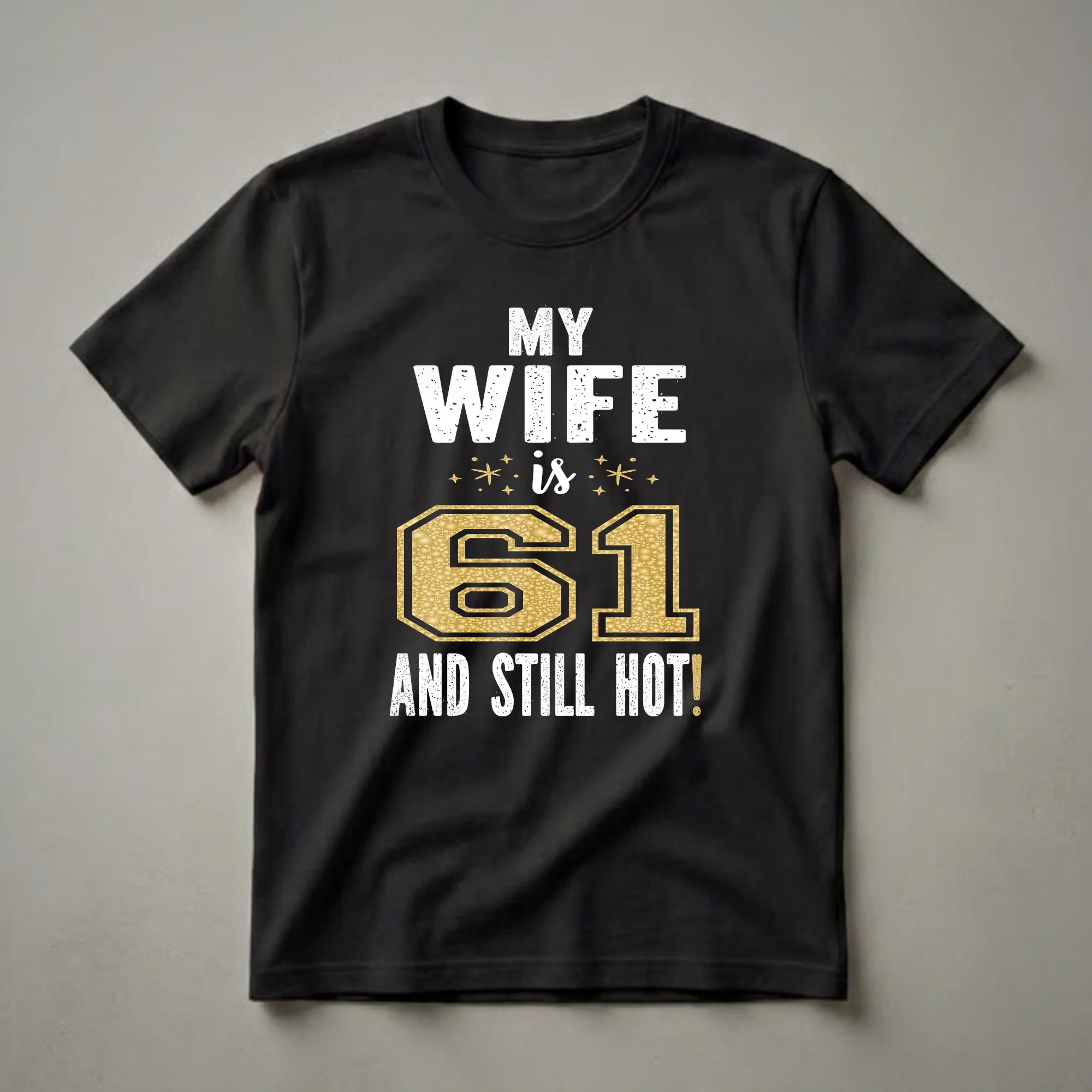 Sixty-one years young and still turning heads! This graphic tee celebrates a wife who is aging like fine wine, proving that age is just a number. The design features bold, distressed white lettering that reads 'MY WIFE is 61 AND STILL HOT!'. The number '61' is prominently displayed in a striking gold color with a textured, bubbly fill, framed by a black outline, making it pop against any background. Small golden starbursts and dots add a touch of sparkle around the word 'is'. This shirt is a fantastic way for a husband to show appreciation for his wife on her milestone birthday. It's a playful and loving statement piece that she can wear to her birthday party, a casual dinner, or any celebration. Turning 61 is a significant milestone, often marking a transition into a new chapter of life, and this shirt embraces that with humor and affection. It makes a thoughtful gift from a husband to his wife, acknowledging her enduring charm and beauty. This t-shirt is a go-to piece for any woman who wants to embrace her age with confidence and a sense of fun. It’s a conversation starter and a declaration of enduring love and admiration.
