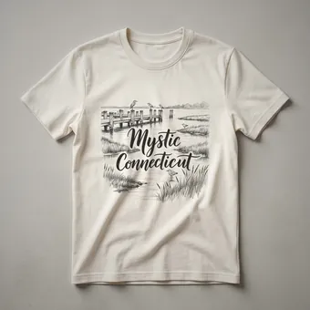 Mystic, Connecticut residents and visitors who appreciate coastal charm will reach for this unique graphic tee. The design captures a serene waterfront scene rendered in a detailed sketch art style. Prominently featured is a wooden pier extending into calm water, with several birds perched on the pilings and others standing in the marshy reeds along the shore. The words "Mystic Connecticut" are elegantly scripted across the center of the design, blending seamlessly with the artistic depiction of the landscape. This t-shirt is more than just apparel; it's a wearable piece of art that evokes the peaceful atmosphere of this historic New England town. Mystic is renowned for its maritime history, particularly the Mystic Seaport Museum and the Mystic Aquarium, making this shirt a perfect memento for anyone who has explored its charming streets and scenic coastline. This tee works well for casual outings, travel adventures, or simply relaxing at home while reminiscing about coastal New England. It makes a thoughtful gift for friends or family who have a special connection to Connecticut or a fondness for picturesque seaside towns. Wear this shirt to celebrate your travels or to share your appreciation for the beauty of Mystic.