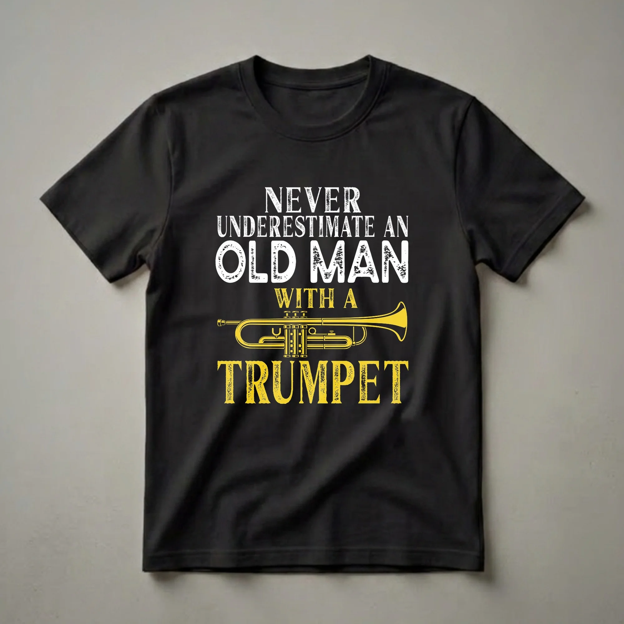 - Features a distressed "Never Underestimate An Old Man With A Trumpet" graphic.