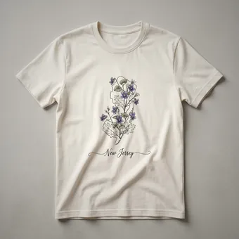 New Jersey residents and fans of the Garden State can now wear their pride with this distinctive graphic tee. The design features a detailed outline of New Jersey, intricately filled with a beautiful illustration of purple violets and their accompanying green leaves. Violets are the official state flower of New Jersey, blooming vibrantly in the state's diverse landscapes, from its pine barrens to its coastal plains. This artistic representation captures the natural beauty of the state, making it a unique piece of apparel. This t-shirt is a thoughtful gift for anyone who calls New Jersey home, whether they live in the bustling cities or the serene countryside. It's a perfect way to celebrate your roots or to remember a special trip. Wear this shirt to local events, casual outings, or simply around the house to showcase your connection to the Garden State. This comfortable tee is a staple for any wardrobe, offering a blend of state pride and natural artistry.