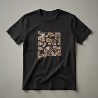 New Mexico residents and admirers of the Land of Enchantment will reach for this striking graphic tee. The design showcases the iconic outline of New Mexico, intricately filled with a retro-inspired botanical illustration. Lush floral elements, including poppies and palm-like fronds, are interspersed with prickly pear cactus and wheat stalks, evoking the diverse landscapes and flora of the state. The words "NEW MEXICO" are prominently displayed in a vintage-style font within the map's borders. This t-shirt works well for anyone celebrating their home state, whether they live there or have fond memories. It makes a thoughtful gift for New Mexico natives, travelers, or anyone who appreciates unique state pride apparel. Wear this shirt to local festivals, outdoor adventures, or casual outings to express your connection to this beautiful southwestern state. The detailed artwork and muted color palette give this shirt a timeless, artistic appeal, making it a staple in any collection celebrating New Mexico.