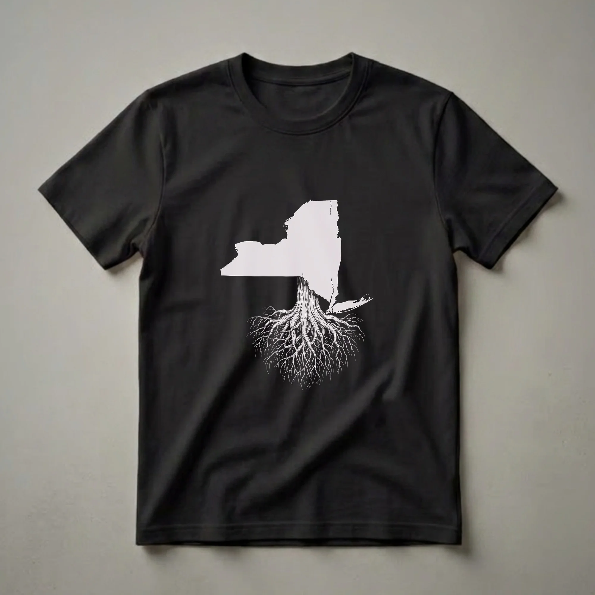 New Yorkers who want to showcase their deep connection to the Empire State will reach for this striking graphic tee. The design features a detailed outline of New York, including Long Island, with an intricate tree root system emerging from its base. This visual metaphor represents the strong foundation and enduring spirit of the state. New York, known for its diverse landscapes ranging from the Adirondack Mountains to the bustling streets of New York City, has a rich history and cultural significance that resonates with its residents. This shirt is more than just apparel; it's a statement of belonging and pride for anyone who calls New York home or has strong ties to it. It makes a thoughtful gift for friends, family, or anyone celebrating their New York heritage. Wear this unique t-shirt to local events, casual outings, or while exploring the many iconic landmarks that make New York so special. This eye-catching tee is a staple for any New Yorker's wardrobe, symbolizing their roots and connection to the state.