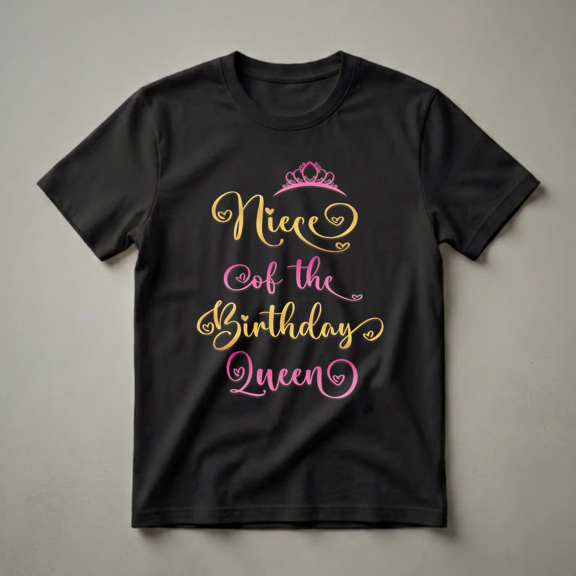 - Niece of the Birthday Queen tee with a pink crown and gradient script.