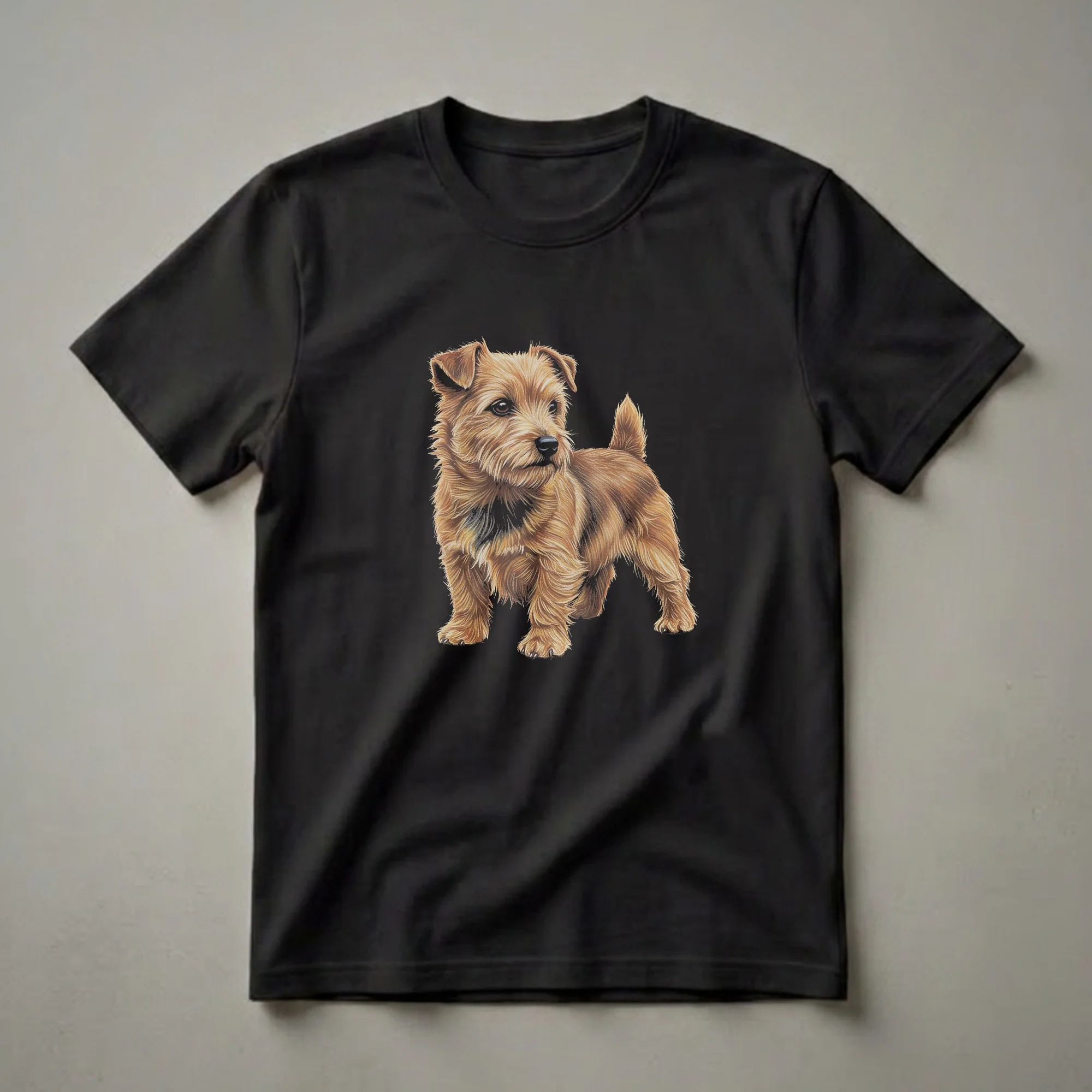 Norfolk Terrier owners know the breed's spirited personality and compact build. This striking graphic tee features a detailed, vintage-style drawing of a Norfolk Terrier, capturing its characteristic wiry coat and alert expression. The artwork is rendered with a warm, reddish-brown hue, highlighting the dog's texture and form against a solid black background, making the subject pop. Norfolk Terriers, originating from England, were historically bred as ratters, known for their tenacity and courage in small packages. This shirt is a staple for any dog mom or dad who appreciates the unique charm of this breed. It makes a thoughtful gift for birthdays, holidays, or just because for the Norfolk Terrier enthusiast in your life. Wear this tee to your next dog park visit or casual outing to spark conversations with fellow canine admirers.