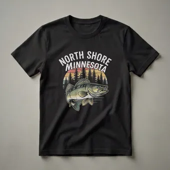 Minnesota anglers who love the rugged beauty of the North Shore will reach for this graphic tee. The design features a detailed illustration of a walleye, a prized game fish found in the cold, clear waters of Lake Superior and other Minnesota lakes. Above the fish, bold, distressed lettering reads "NORTH SHORE MINNESOTA," set against a retro sunset with silhouetted pine trees. This t-shirt captures the spirit of adventure and the thrill of the catch that defines fishing in this iconic region. It's a staple in the collection for anyone who cherishes the outdoors and the unique fishing opportunities the state offers. This shirt makes a thoughtful gift for the fisherman or fisherwoman in your life who dreams of casting a line on the Great Lakes. Wear it on your next fishing trip, to a casual gathering with fellow outdoors enthusiasts, or simply as a reminder of your favorite lakeside memories. The vintage aesthetic adds a timeless appeal, making this more than just a shirt, it's a piece of Minnesota pride.
