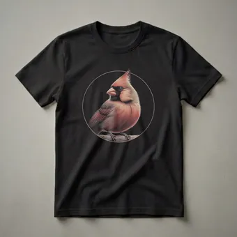 Birdwatchers and nature enthusiasts will appreciate this detailed graphic tee featuring a Northern Cardinal. The artwork showcases the bird perched on a weathered branch, its distinctive crest and coral-pink plumage rendered with intricate detail. Northern Cardinals are known for their vibrant color and cheerful song, often found in woodlands, gardens, and shrublands across eastern North America. This shirt captures the essence of these beautiful birds, making it a standout piece for anyone who cherishes wildlife. The design is presented within a subtle circular frame, adding an artistic touch to the overall composition. This t-shirt is a wonderful way for bird lovers to express their passion for ornithology and the natural world. It makes a thoughtful gift for the birdwatcher in your life who enjoys observing these common yet captivating backyard visitors. Wear this tee on your next nature walk or to a casual gathering to spark conversations about avian beauty.