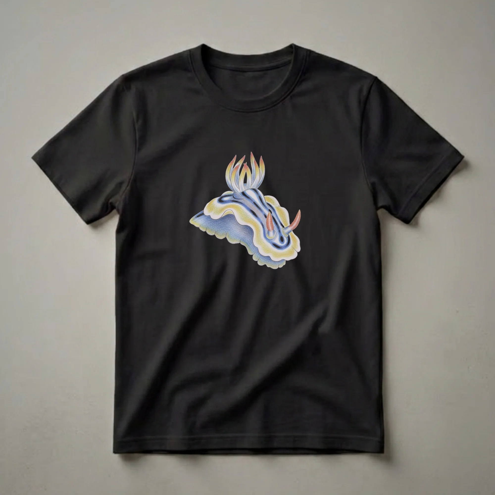 Marine life enthusiasts will appreciate the intricate detail of this nudibranch drawing t-shirt. The artwork features a vibrant sea slug, rendered in a classic drawing style with striking blue, yellow, and white patterns, accented by delicate cerata and rhinophores. Nudibranchs, often called sea slugs, are a diverse group of marine gastropod mollusks known for their extraordinary colors and forms, inhabiting oceans worldwide from shallow reefs to deep-sea environments. This graphic tee is a wonderful way for divers, snorkelers, or anyone fascinated by the ocean's biodiversity to express their passion. It makes a thoughtful gift for marine biologists, oceanographers, or individuals who find beauty in the underwater world. Wear this unique shirt to your next beach outing, aquarium visit, or casual gathering to spark conversations about these fascinating creatures. This apparel is a staple for anyone who cherishes the wonders of the sea.