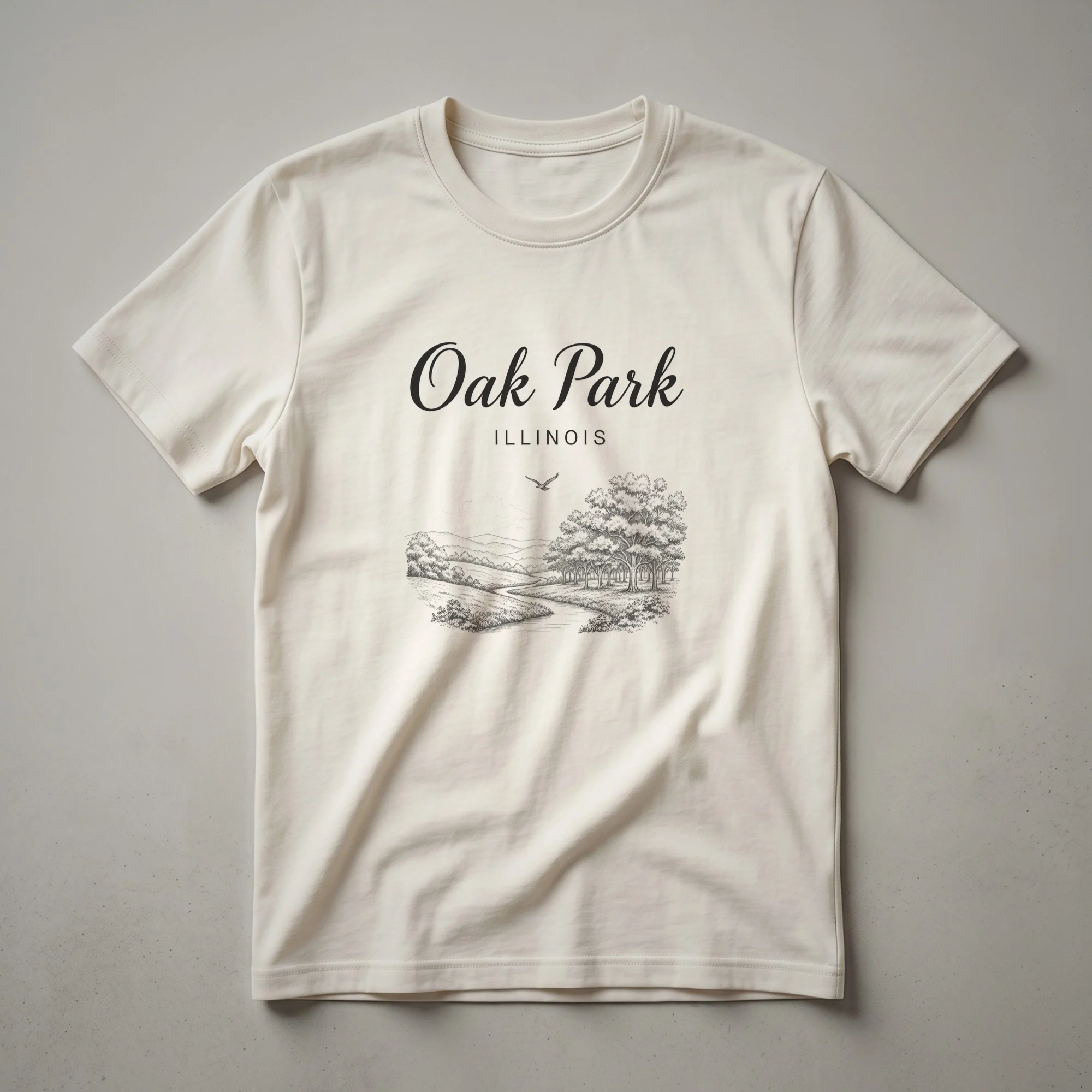 Oak Park, Illinois residents and fans of the Prairie School architectural style will appreciate this distinctive graphic tee. The design features the name 'Oak Park ILLINOIS' in an elegant script font, set above a detailed sketch of a serene landscape. This artwork depicts a winding path leading through rolling hills, flanked by mature trees on one side and a distant treeline on the other. A solitary bird soars in the sky, adding a touch of natural beauty to the scene. Oak Park is renowned for its Frank Lloyd Wright Home and Studio, a significant landmark in American architecture, and this shirt captures a sense of the town's natural charm and artistic heritage. This t-shirt makes a thoughtful gift for anyone who calls Oak Park home or holds fond memories of visiting this vibrant Illinois community. Wear this shirt to local events, casual outings, or while exploring the unique architecture that defines Oak Park. It's a staple in the collection for those who cherish their connection to this historic Illinois village.