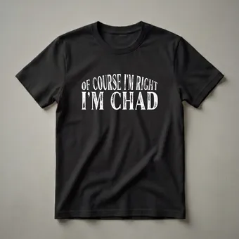 Chad, this personalized t-shirt is for you. Featuring bold, distressed white lettering that proclaims 'OF COURSE I'M RIGHT' on the top line and 'I'M CHAD' on the bottom, this tee makes a clear statement. The design is printed on a black background, creating a striking contrast that ensures your message is seen. This shirt is a staple in the collection for anyone who knows they're always right, especially if their name is Chad. It's a humorous way to express self-assurance and a playful take on confidence. This graphic tee works well for casual outings, game nights, or as a conversation starter. It makes a thoughtful gift for any Chad in your life who appreciates a good laugh and isn't afraid to own their opinions. Whether it's for a birthday, a holiday, or just because, this personalized shirt is sure to be a hit. Wear it to your next gathering and let everyone know who's in charge of being right.