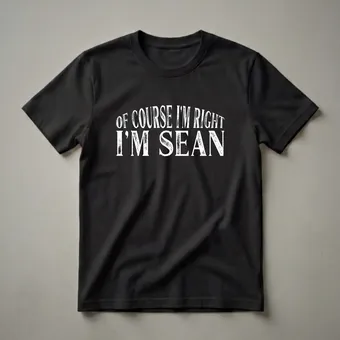 Sean knows he's always right, and this personalized t-shirt proudly proclaims it. The bold white lettering, featuring a distressed texture, stands out against the black background. The top line reads 'OF COURSE I'M RIGHT,' with the name 'SEAN' prominently displayed below in larger font. This shirt is a fantastic way for Sean to express his confidence and perhaps a bit of playful arrogance. It's a staple in the collection for any Sean who enjoys a good laugh and isn't afraid to state their opinion. This tee works well for casual outings, family gatherings, or just lounging around the house. It makes a thoughtful gift for any Sean celebrating a birthday, Father's Day, or any occasion where a personalized touch is appreciated. Imagine Sean wearing this shirt to his next birthday party, drawing smiles and nods of agreement from friends and family who know his personality well. This graphic tee is a conversation starter and a declaration of self-assuredness, making it a go-to tee for Sean.