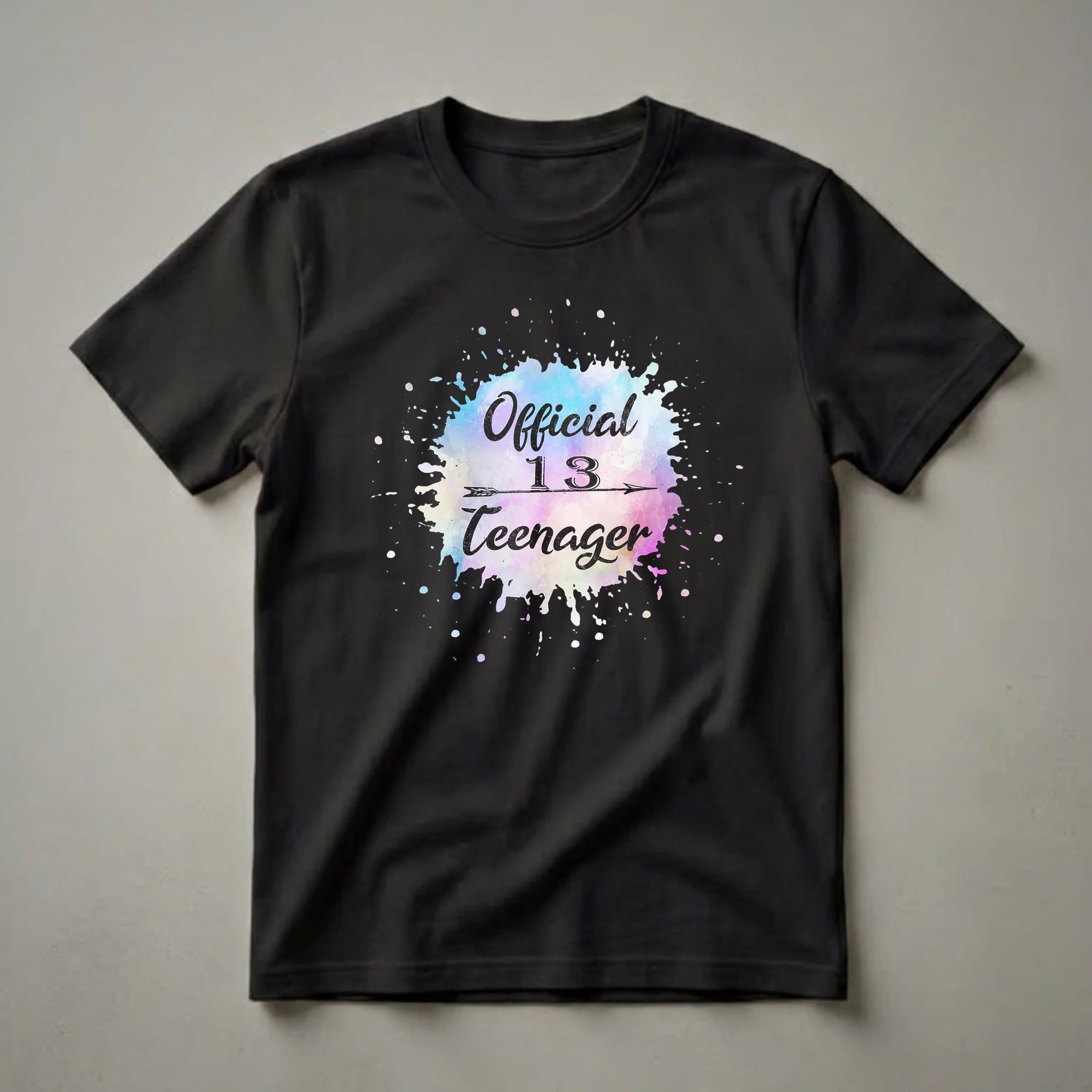 Turning thirteen is a major milestone, marking the official transition into the teenage years. This "Official 13 Teenager" graphic tee captures that exciting moment with a vibrant design. The text "Official 13 Teenager" is presented in a stylish, distressed font, centered over a colorful watercolor splash that blends shades of blue, pink, and yellow. An arrow graphic pierces through the number 13, adding a touch of edgy flair. This shirt is a fantastic way for any girl to announce her new status as a teenager. It's a thoughtful gift for a daughter, niece, or granddaughter celebrating her 13th birthday. Imagine her wearing this t-shirt to her birthday party or out with friends, feeling confident and celebrated. This eye-catching tee is a staple for any young person entering their teen years, a go-to for casual wear or special birthday occasions. It's more than just apparel; it's a statement piece for a significant birthday.