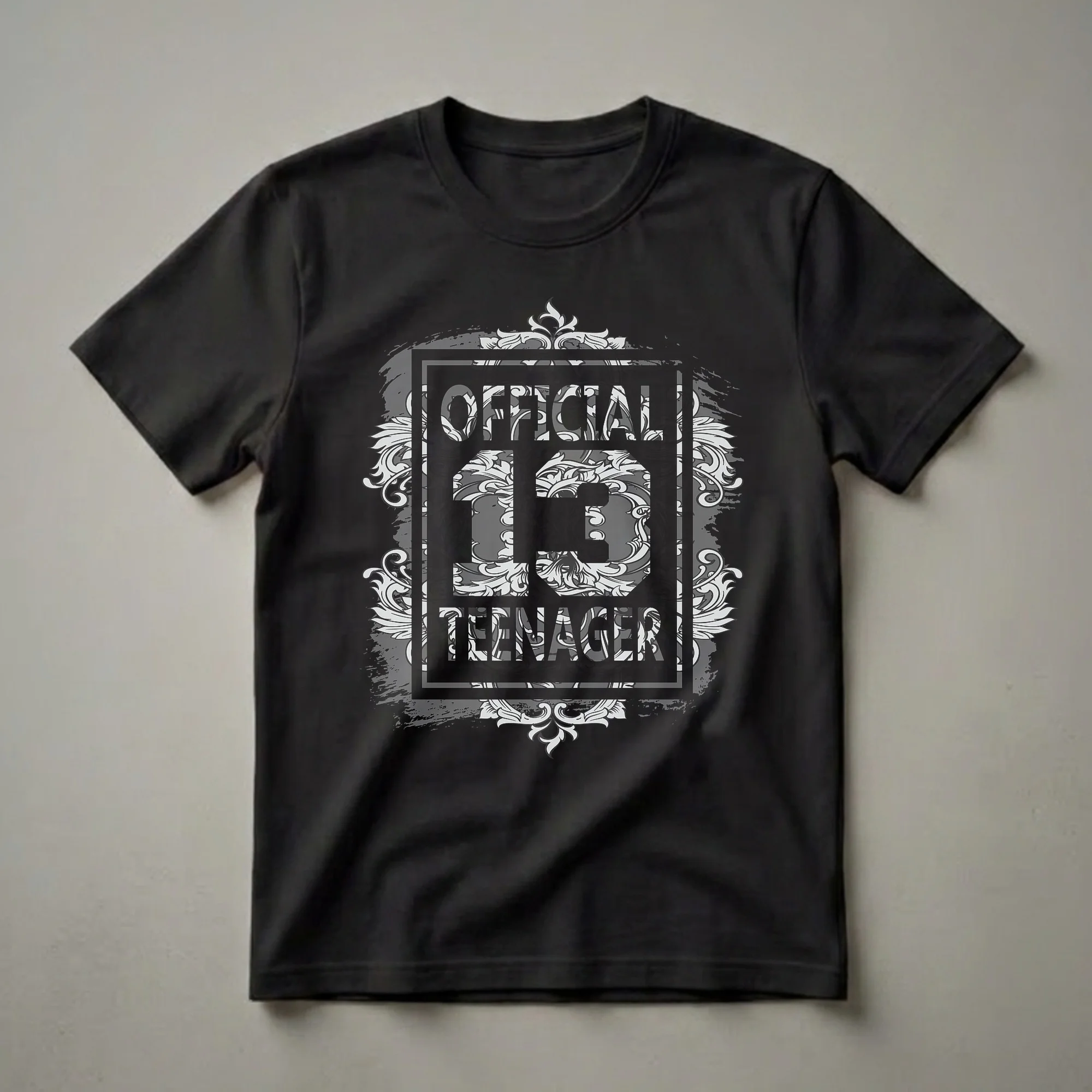 Turning thirteen marks a significant transition into the teenage years, a milestone celebrated with this 'Official 13 Teenager' graphic tee. The design features bold, distressed lettering for 'OFFICIAL 13 TEENAGER' set against a backdrop of ornate, vintage-style filigree and grunge brush strokes. This striking visual appeals to boys entering adolescence, signifying their new status. This t-shirt is a fantastic way for a 13-year-old to express their excitement about reaching this age. It's a staple for any birthday celebration, whether it's a party, family dinner, or casual get-together. The graphic tee serves as a memorable keepsake from their thirteenth birthday. This shirt makes a thoughtful gift for any boy who is turning 13, offering a cool and stylish way to commemorate the occasion. He will reach for this tee to show off his new teen status. The bold design ensures he stands out and feels celebrated on his special day. This apparel is a go-to for casual wear or for the birthday party itself.
