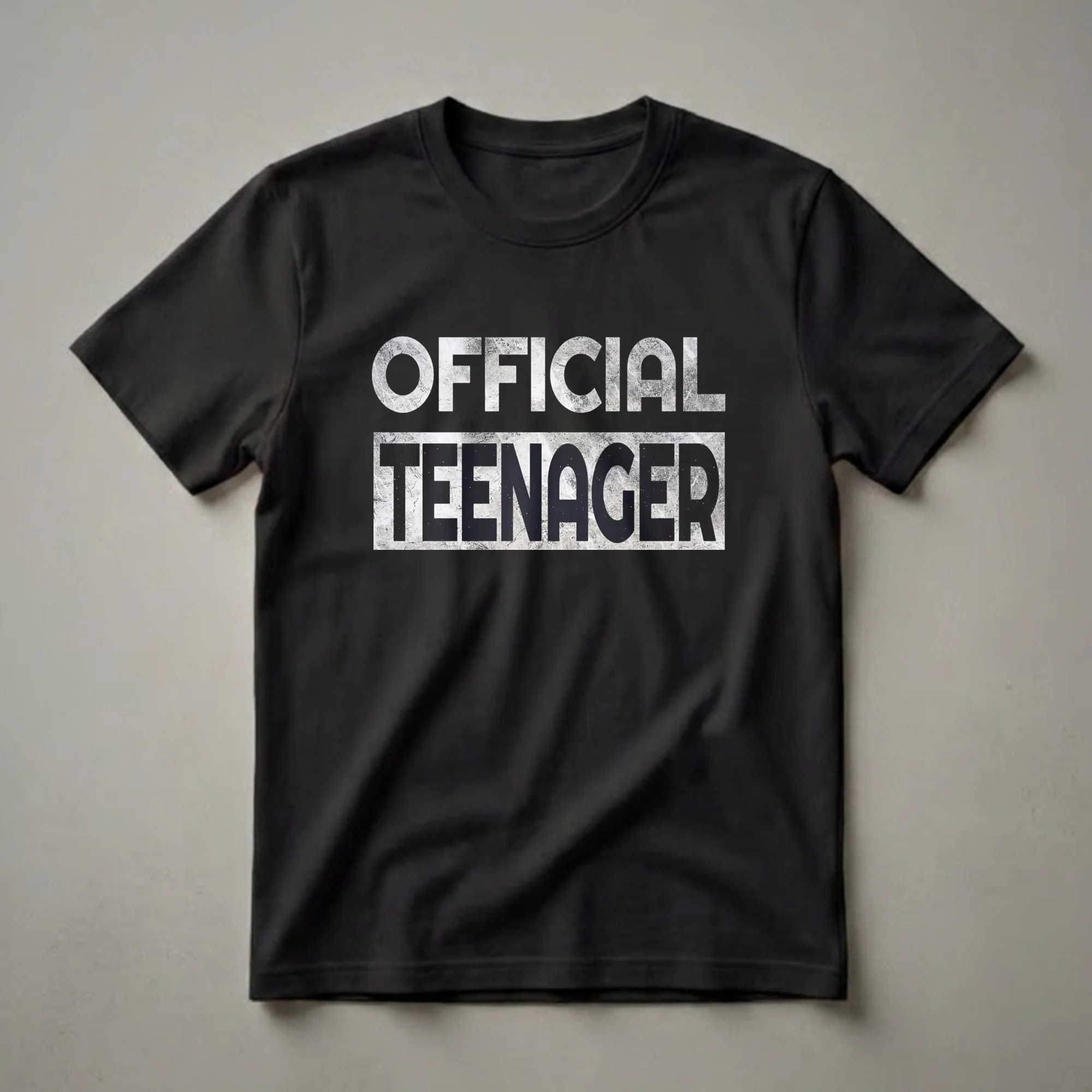 Celebrate the monumental occasion of your thirteenth birthday with this bold "Official Teenager" graphic tee.This graphic tee proudly declares 'OFFICIAL TEENAGER' in bold, distressed lettering, a natural fit for any 13-year-old celebrating this momentous occasion. The striking design features 'OFFICIAL' in white with a concrete texture, set against a black background, followed by 'TEENAGER' in black with the same textured effect. This shirt is a fantastic way for tweens and teens to express their new status. It's a staple for any birthday party outfit, whether they're heading to a family dinner, a gathering with friends, or a fun-filled celebration. This t-shirt also makes a thoughtful gift for any young person hitting this age milestone. Imagine the smile on their face when they unwrap this cool tee, ready to embrace their teenage adventures. It’s a wearable declaration of independence and a fun addition to their wardrobe, suitable for casual wear throughout the year.