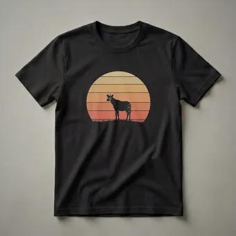 Okapi enthusiasts who appreciate the unique beauty of this elusive mammal will reach for this striking graphic tee. The design features a silhouette of an okapi standing against a retro sunset, rendered in warm, horizontal stripes of yellow, orange, and red. This visual evokes a sense of the okapi's natural habitat, the dense rainforests of the Democratic Republic of Congo, where they are most active during dawn and dusk. Okapis, often called the 'forest giraffe' due to their close relation to giraffes, possess distinctive zebra-like markings on their legs, a feature clearly visible in this artistic depiction. This shirt is a thoughtful gift for any wildlife lover, nature photographer, or zoologist who admires these shy creatures. It's a perfect addition to a casual wardrobe, great to wear on nature walks, to educational events, or simply while relaxing at home. The vintage aesthetic makes this t-shirt a conversation starter, celebrating the wild and wonderful okapi.