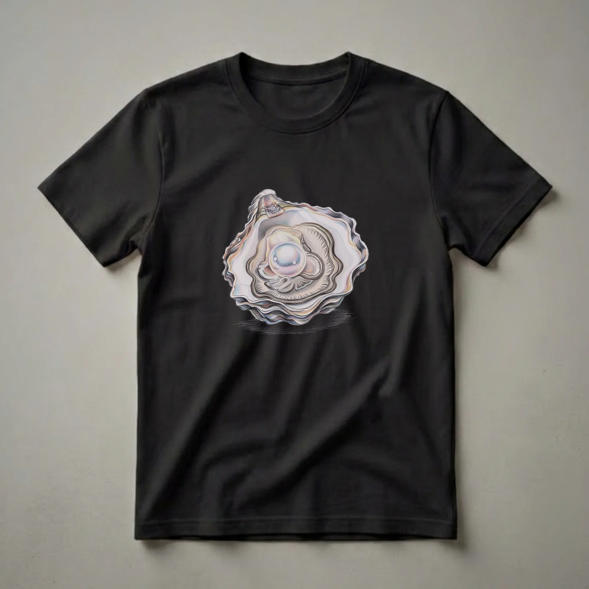 Oyster and pearl enthusiasts will appreciate the intricate detail of this artistic t-shirt. The design features a beautifully rendered open oyster, its rough, textured shell contrasting with the smooth, iridescent pearl nestled within. The artwork, created with colored pencils, captures the delicate sheen and subtle hues of the pearl, reflecting soft pinks, blues, and yellows. Oysters are bivalve mollusks that are found in marine, brackish, and saltwater habitats around the world. They are known for their ability to produce pearls, which form when an irritant, such as a parasite or a piece of shell, becomes lodged inside the oyster. The oyster then secretes layers of nacre around the irritant, creating a pearl over time. This unique graphic tee is a thoughtful gift for anyone who admires the natural beauty of marine life or appreciates detailed artistic renderings. It's a go-to tee for casual outings, beach trips, or simply relaxing at home while dreaming of the sea. Wear this shirt to express your connection to the ocean's treasures.
