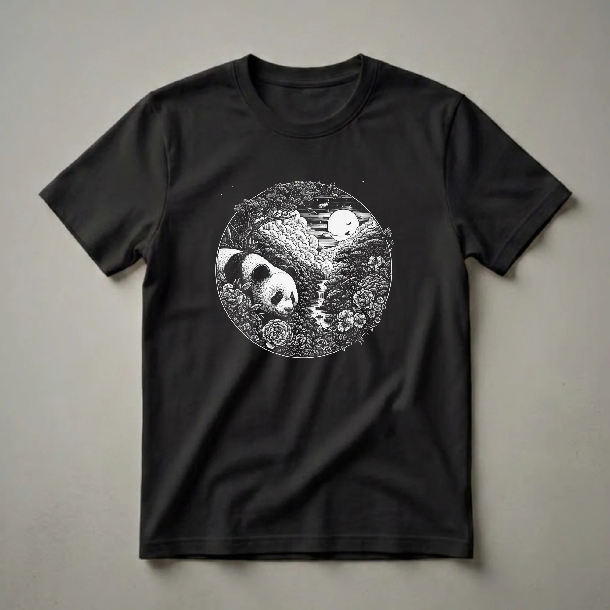 Nature lovers and panda admirers will adore this graphic t-shirt featuring a tranquil scene of a panda amidst a moonlit forest and waterfall. This eye-catching graphic tee captures the serene beauty of their natural habitat. The artwork depicts a panda nestled within a vibrant, detailed forest scene, complete with lush foliage, a cascading waterfall, and a serene moonlit sky. Intricate trees and blooming flowers frame the central image, creating a circular, almost dreamlike composition. This t-shirt is a thoughtful gift for any panda enthusiast or someone who appreciates the tranquility of nature. It's a unique piece of apparel that allows wearers to showcase their love for these gentle giants and the wild places they inhabit. Whether you're hiking through the woods or simply enjoying a quiet day, this shirt brings a touch of the wild to your wardrobe. It's a staple for anyone who finds solace and wonder in the natural world and its inhabitants. This graphic shirt is a conversation starter for nature lovers.