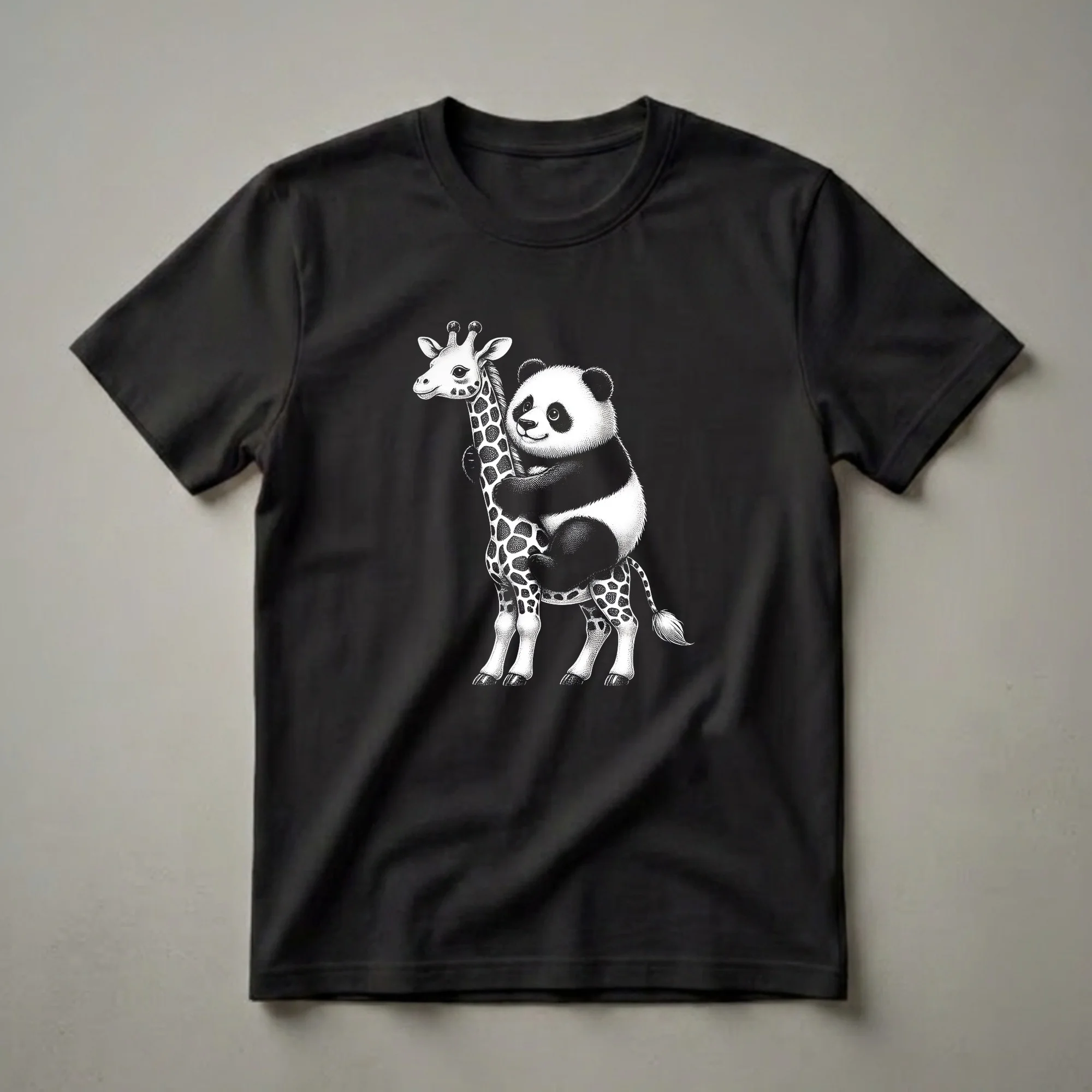 - This whimsical graphic tee showcases a playful panda riding a friendly giraffe, a delightful image for animal lovers.