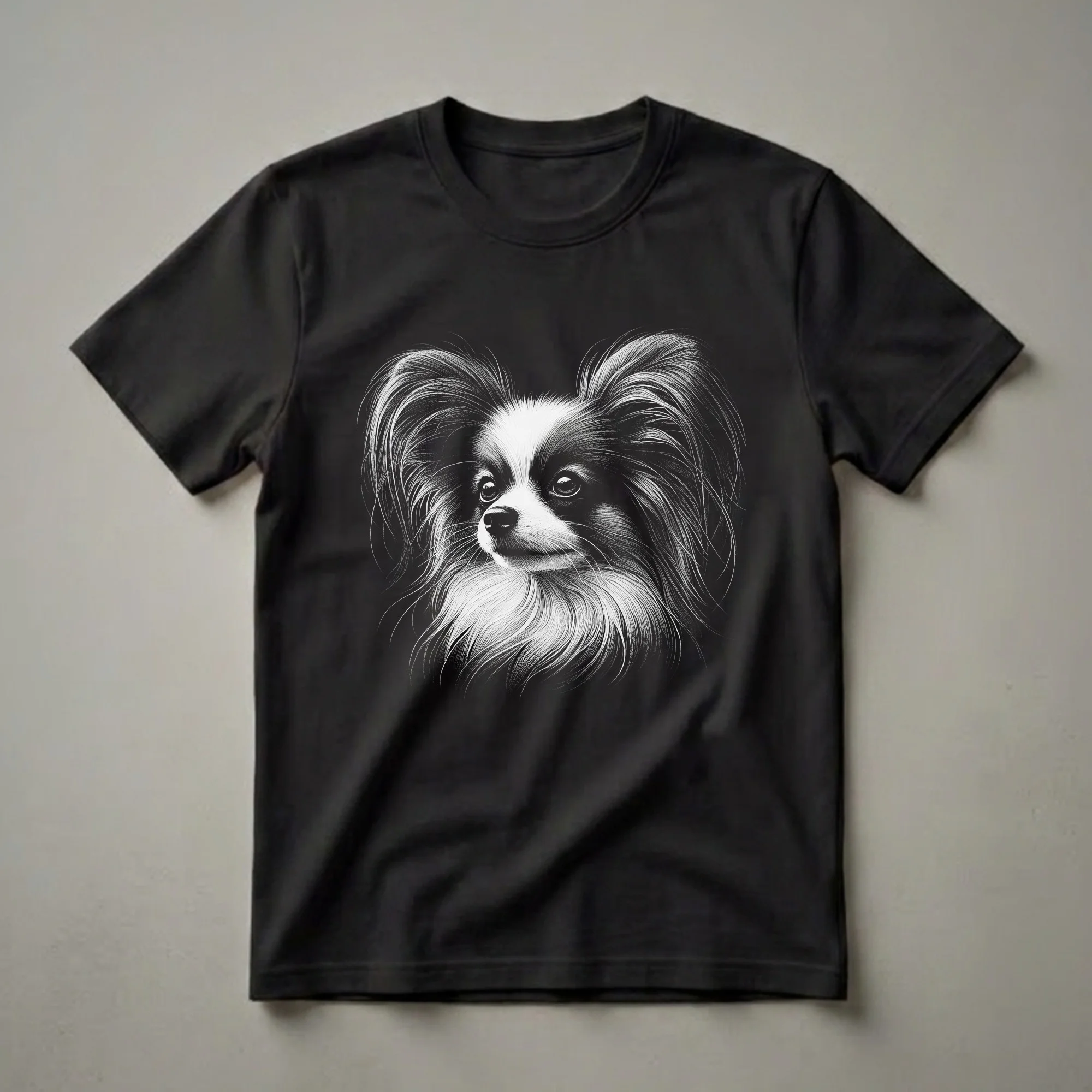 Papillon owners know the breed's charming personality and distinctive butterfly-like ears. This eye-catching graphic tee features a detailed black and white sketch of a Papillon dog's face, capturing its alert expression and flowing fur. The art style uses fine lines to create depth and texture, making the dog's features pop against the dark background. Papillons, originating from France and Belgium, are known for their intelligence and playful nature, often ranking high in dog agility competitions. This shirt is a wonderful way for any Papillon enthusiast to express their affection for their beloved companion. It makes a thoughtful gift for the dog mom or dog dad who cherishes their small, spirited friend. Wear this unique t-shirt to dog parks, casual outings, or simply while relaxing at home with your furry family member. It's a staple in the collection for anyone who appreciates fine dog art and wants to showcase their breed pride.