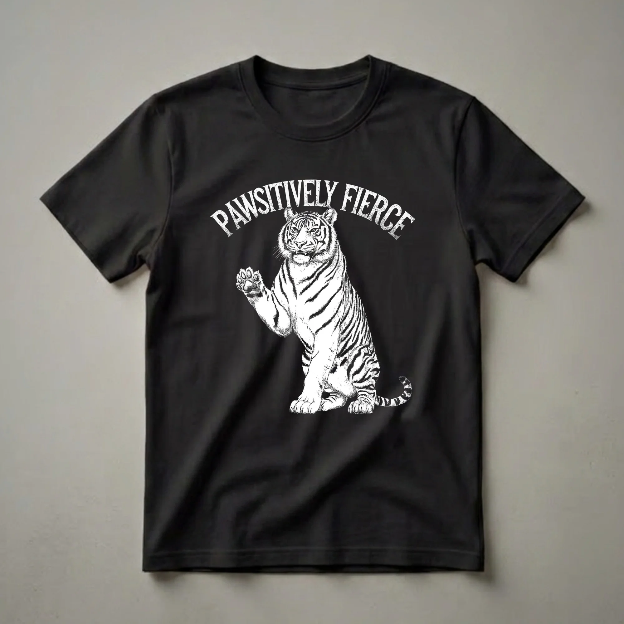 Tiger enthusiasts who appreciate a bit of wit will reach for this eye-catching graphic tee. The design features a detailed black and white sketch of a majestic tiger, sitting regally with one paw raised in a playful wave. Arched text above the tiger reads "PAWSITIVELY FIERCE," a clever pun that perfectly captures the spirit of these powerful felines. Tigers, known for their striking orange and black stripes and formidable presence, are the largest cat species in the world. They inhabit diverse environments across Asia, from the Siberian taiga to the mangrove swamps of Sundarbans. This shirt is a thoughtful gift for anyone who admires these magnificent creatures and enjoys a touch of humor in their wardrobe. It’s a great conversation starter, a thoughtful choice for casual outings, game nights, or just lounging around. Wear this tee to express your love for big cats with a smile and a roar. This t-shirt is a staple for anyone who wants to showcase their bold personality and appreciation for wildlife with a humorous twist.